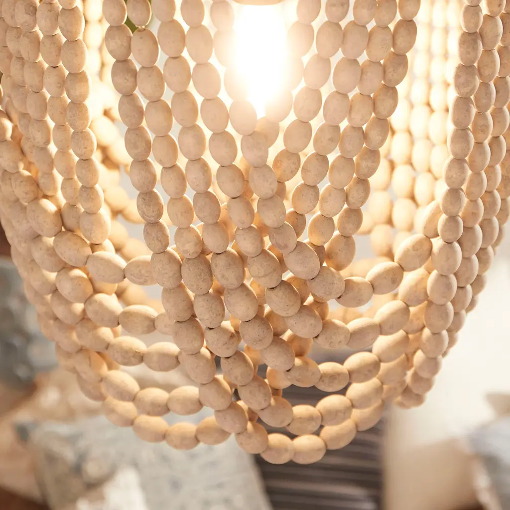 Punctuate a compact nook or living area with this exotic pendant. With a hint of Bohemian style, its wrapped strands of creamy wood beads bring a natural look and feel, while a ring base of tinted raw metal preserves its earthy attitude.