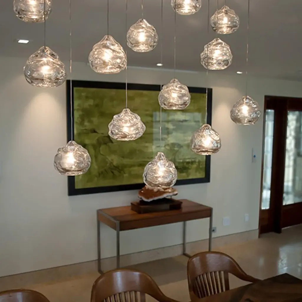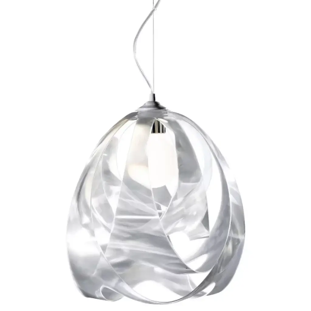 Small opaline white happy pendant light, hand blown glass by Siemon & Salazar, canopy includedGlass measures 4.5”T x 4.5”WThese works play with the reflective and malleable qualities of glass. This line consists of heavy thick-walled pieces, which are hand manipulated to create a creased and singularly individual form for each piece. The works are either blown in solid clear crystal or use the Italian technique of ‘sommerso’ or encased color. The happy lights take advantage of the thickness and brilliance of our crystal to create a light with unending refractions. Hand blown and shaped in lead free crystal. No molds are used, and each glass shape is unique. Designed and made by Siemon & Salazar in California. Signed and dated.Specifications:- Low voltage halogen fixture with ETL listed components- MAX WATT 20 halogen- Light assembly, 7’ cord, Fast Jack connector, bi-pin 20W halogen bulb, canopy, and transformer includedColor variations:Clear, opaline, aubergine, steel grey, steel blue, amberFinish options:- Satin nickel (-SN)- Dark bronze (-BZ)Product number: S06-1856-135-XX-HAXX
