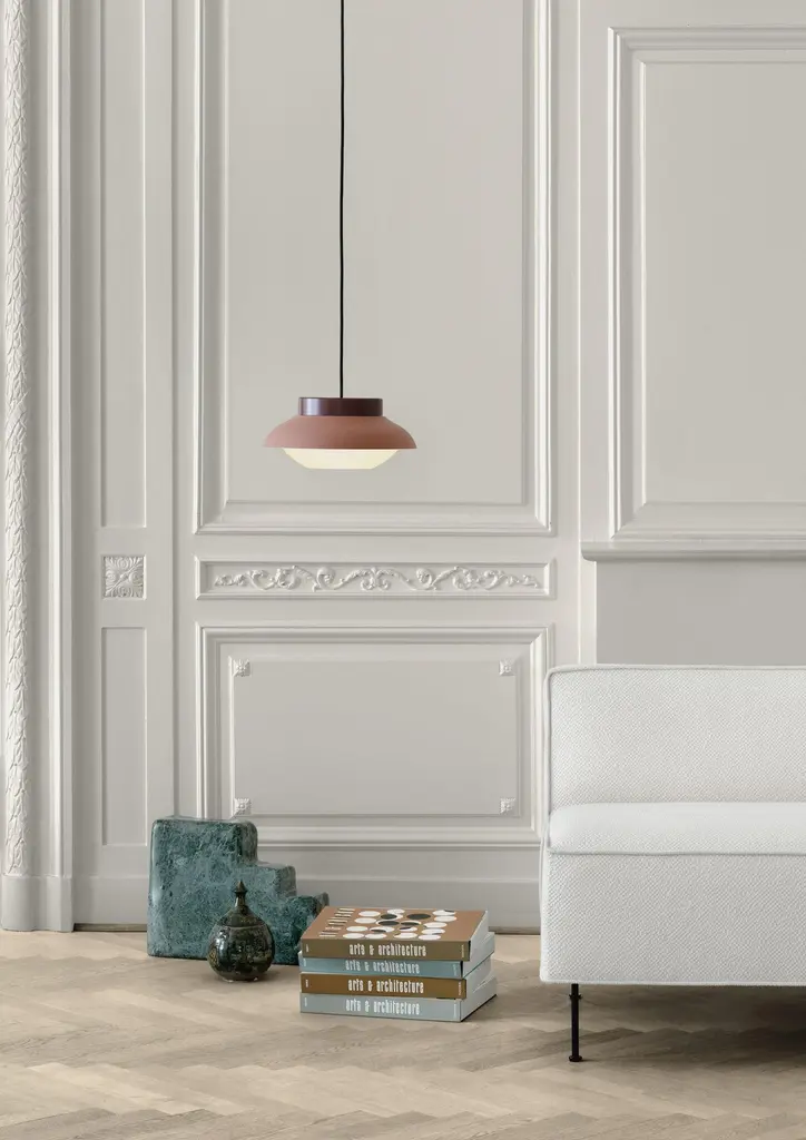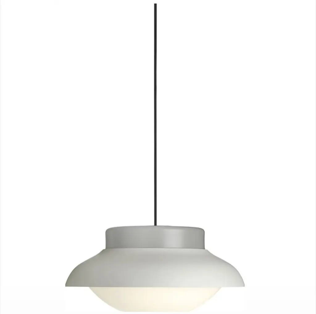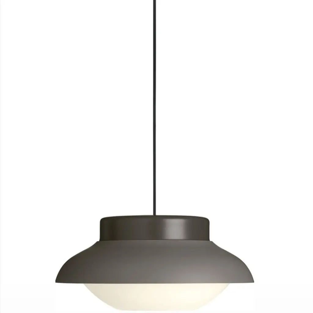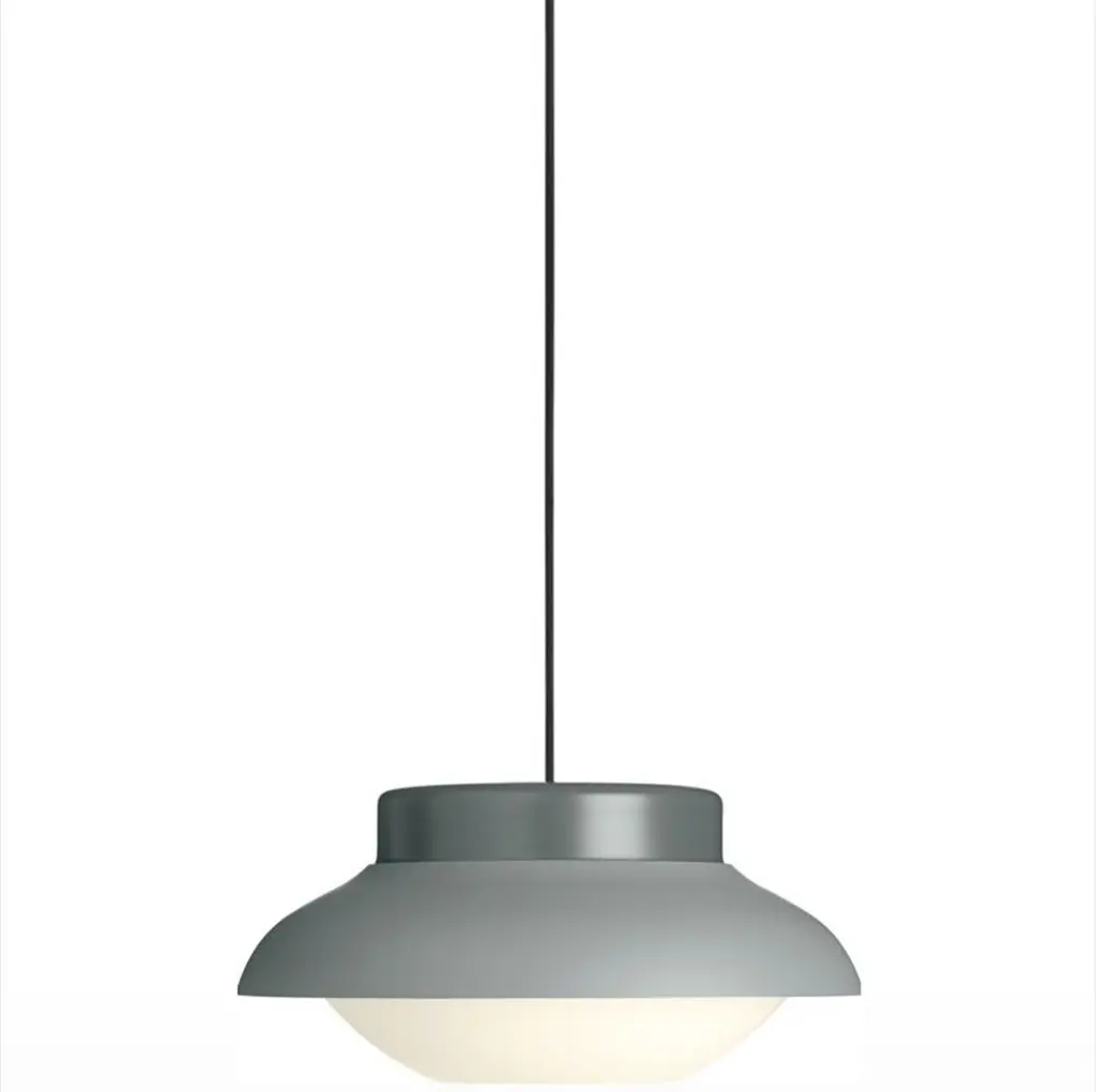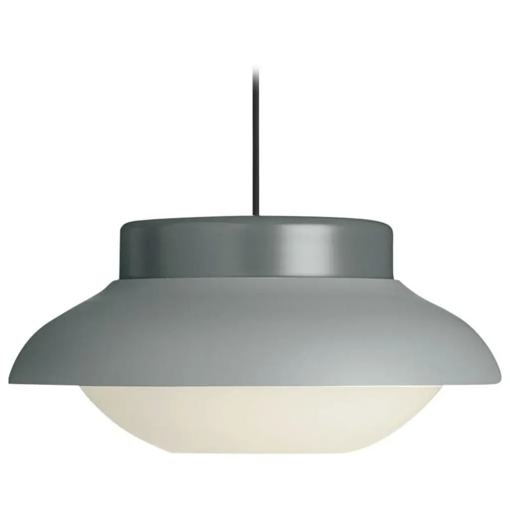 Small Sebastian Herkner collar pendant in stone grey for Gubi. Created by German designer Sebastian Herkner, the collar pendant is executed in steel, mouth-blown glass, and powder-coated aluminum. Each pendant is crafted using traditional techniques which gives every lamp its unique and iconic look. Its strong character is achieved by the combination of the soft rounded glass, with a matte surface, and a steel "collar", used as a reflector, that together perfectly diffuses a warm light that sets just the right lighting atmosphere.The lamp looks great as a single feature alone over a table, but by mixing colors and large and small Collar Pendants, it gives possibilities for personalized and playful installations.Price is per item. Also available in a larger size and in a variety of colors: Taupe soft matt, terracotta light matt, soft fog matt, carbone semi matt.In-stock lead-time 2-3 weeks. Out of stock lead time can take several weeks more. Availability can change at any time. Made to order. All sales are final. Bulb requirements: Socket: E26 base; Bulb type: G16.5. Recommended wattage: 40 W - Max wattage: 40 W.