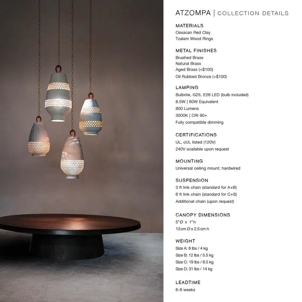Our Atzompa collection is created in the Oaxacan town of Santa María Atzompa, where the pottery-making tradition has roots tracing back to ancient Zapotec culture.Building on this tradition, we formed a partnership with master artisan Eligio Zarate, whose family has for generations worked to bring innovation to this centuries-old craft.Using a red clay that comes from local mountains, the pieces in this collection are first given form within custom gesso molds. Emerging from the molds, the repeating openwork designs-which play on motifs that are carved in to the stone at Mitla, the neighboring archeological ruins-are meticulously cutout one by one. Each piece is brushed with a white wash, or dipped in an emerald-hued glaze, and then finished in a kiln firing.DIMENSIONS9.5” Ø x 14” h24 cm Ø x 35.5 cm hLAMPINGSingle SocketBulbrite, G25, E26 LED (bulb included)8.5W 60W Equivalent800 Lumens3000K CRI 90+Fully compatible dimmingCERTIFICATIONSUL, cUL listed (120V) 240V available upon requestMOUNTINGUniversal ceiling mount; hardwiredSUSPENSION3 ft link chain (standard)METAL FINISHAged Brass.