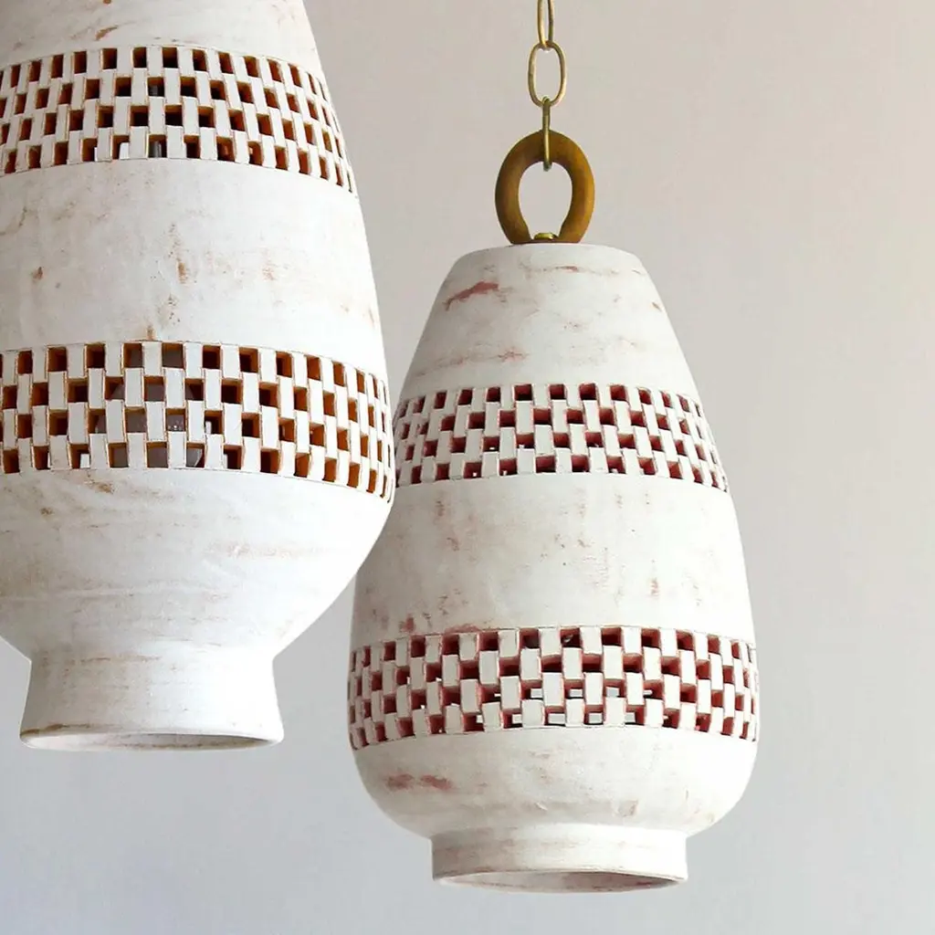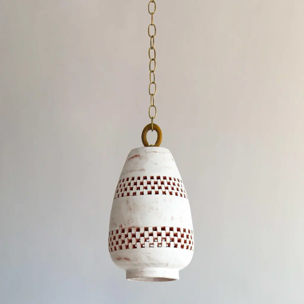 Our Atzompa Collection is created in the Oaxacan town of Santa María Atzompa, where the pottery-making tradition has roots tracing back to ancient Zapotec culture.Building on this tradition, we formed a partnership with master artisan Eligio Zarate, whose family has for generations worked to bring innovation to this centuries-old craft.Using a red clay that comes from local mountains, the pieces in this collection are first given form within custom gesso molds. Emerging from the molds, the repeating openwork designs, which play on motifs that are carved in to the stone at Mitla, the neighboring archeological ruins, are meticulously cut out one by one. Each piece is then brushed with a white wash before being fired in a wood-burning pit.DIMENSIONS9.5” Ø x 14” h24 cm Ø x 35.5 cm hLAMPINGSingle SocketBulbrite, G25, E26 LED (bulb included)8.5W 60W Equivalent800 Lumens3000K CRI 90+Fully compatible dimmingCERTIFICATIONSUL, cUL listed (120V) 240V available upon requestMOUNTINGUniversal ceiling mount; hardwiredSUSPENSION3 ft link chain (standard)METAL FINISHNatural Brass.