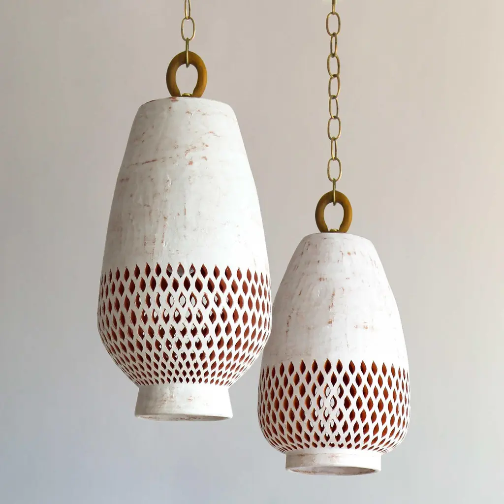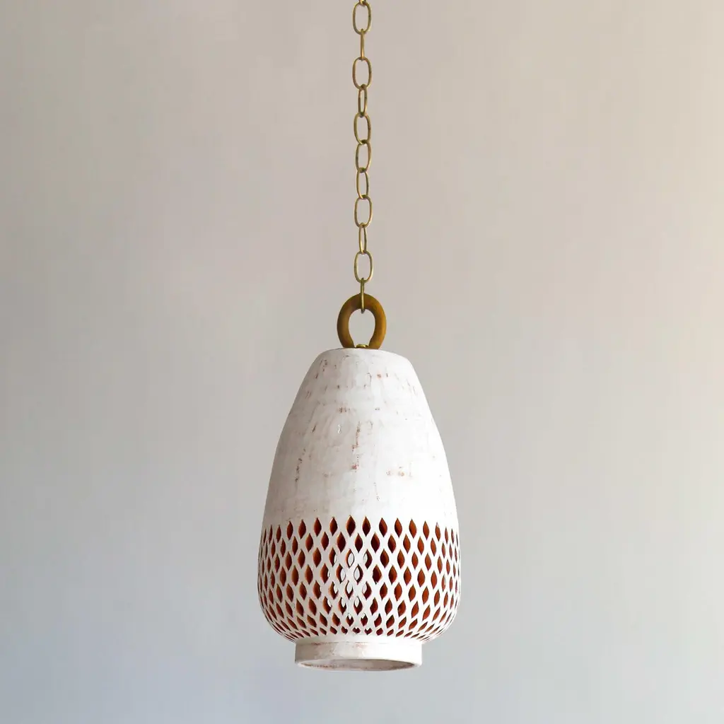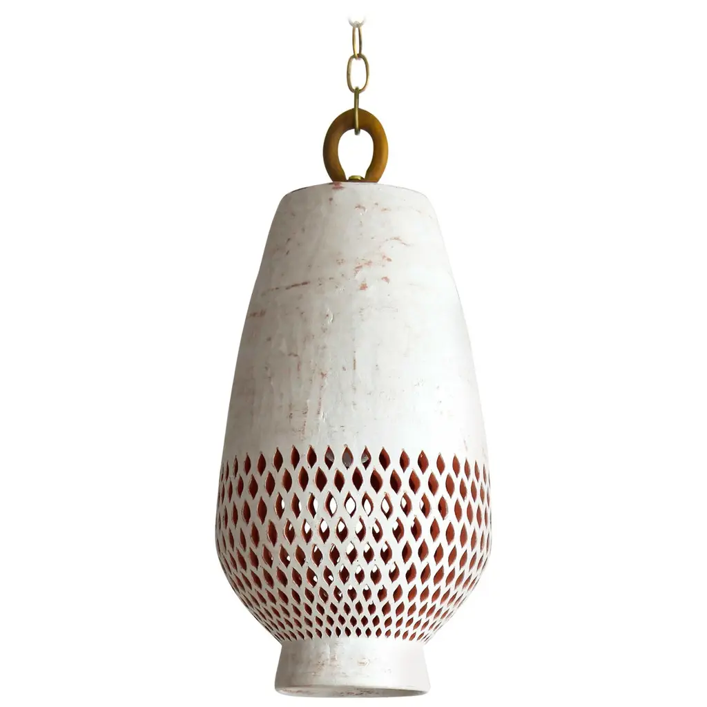 Our Atzompa collection is created in the Oaxacan town of Santa María Atzompa, where the pottery-making tradition has roots tracing back to ancient Zapotec culture.Building on this tradition, we formed a partnership with master artisan Eligio Zarate, whose family has for generations worked to bring innovation to this centuries-old craft.Using a red clay that comes from local mountains, the pieces in this collection are first given form within custom gesso molds. Emerging from the molds, the repeating openwork designs-which play on motifs that are carved in to the stone at Mitla, the neighboring archeological ruins-are meticulously cutout one by one. Each piece is brushed with a white wash, or dipped in an emerald-hued glaze, and then finished in a kiln firing.Dimensions:9.5” Ø x 14” H24 cm Ø x 35.5 cm H.Lampingsingle socketbulbrite, G25, E26 LED (bulb included)8.5W 60W equivalent800 lumens3000K CRI 90+fully compatible dimming.CertificationsUL, cUL listed (120V) 240V available upon request.Mountinguniversal ceiling mount; hardwired.Suspension3 ft link chain (standard).Metal finishoil rubbed bronze.