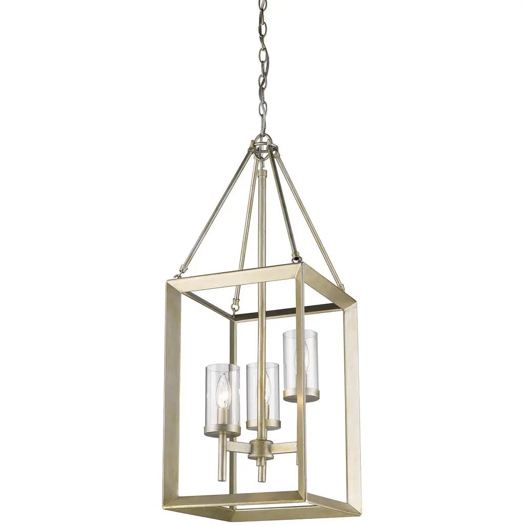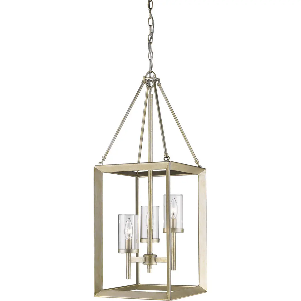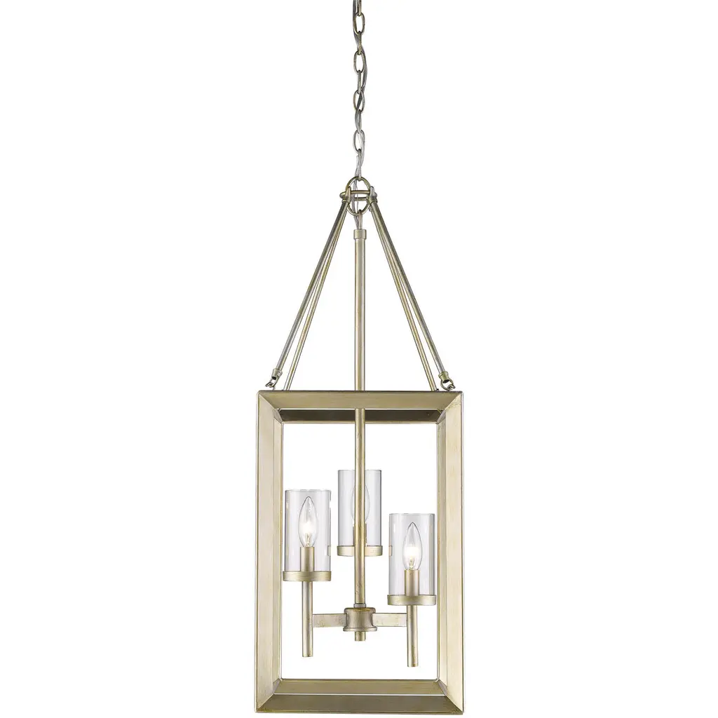 Bring timeless elegance into your home with the Golden Lighting Smyth 3-light Pendant in White Gold. Featuring a clear glass shade and a white gold frame, it creates a welcoming atmosphere. The clear glass shade allows for brilliant, unobstructed light, showcasing the beauty of the bulb and the fixture's design, while its polished finish adds a refined touch to any decor. Our White Gold finish offers a unique blend of warmth and coolness with a rustic texture, giving it the character of a cherished heirloom. Perfect for internal spaces such as bedrooms, living rooms, and dining rooms, this fixture is ideal for dry locations. It's sloped-ceiling compatible and has an adjustable height ranging from 35" to 107". The overall dimensions are 12"W x 32"H x 12"D and it requires three E12 candelabra base bulbs (not included) with a maximum of 60 watts per bulb. This pendant light adds a stylish statement to various settings, enhancing your home with quality and elegance.