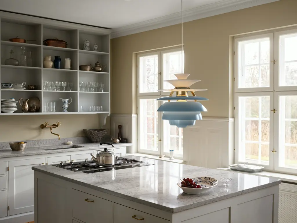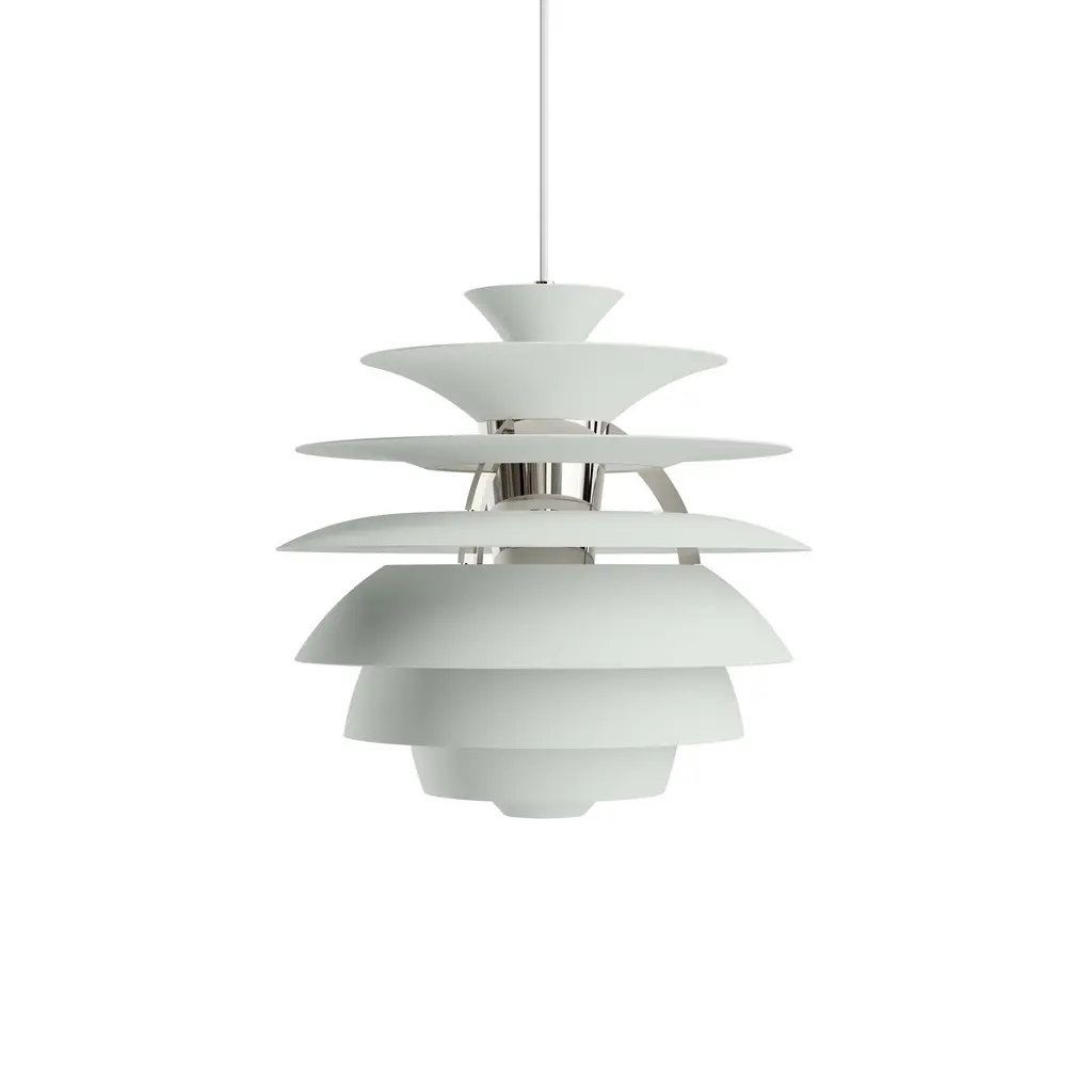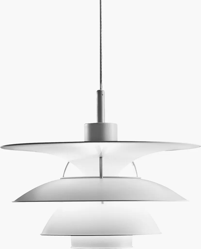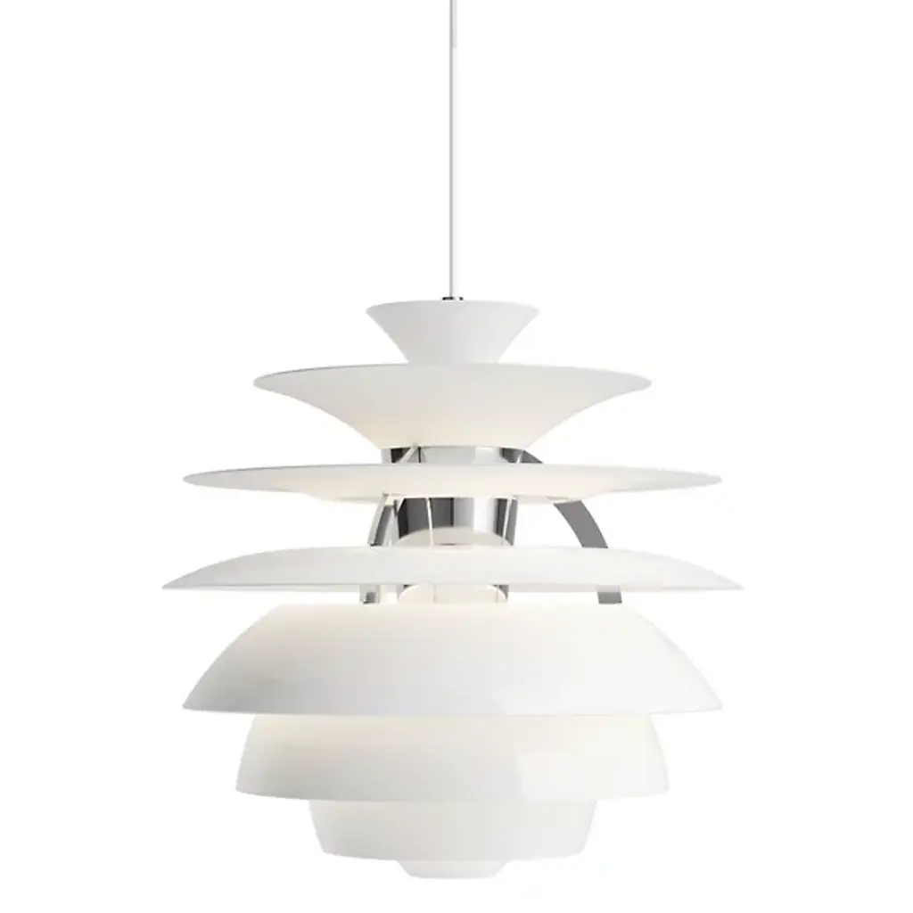 Poul Henningsen's Snowball Pendant (1924) is as much about mathematics as it is about light. The shapes in this light are precisely aligned so that every surface receives a ray of light at exactly the same angle. These rays of light are then reflected, the degree of which is controlled by Henningsen's careful placement of matte or glossy finish. The result is optimal and even distribution of light that's completely without glare. While the form of the Snowball is surprisingly modern for 1924, Henningsen did not design this lamp to celebrate the new technology of the electric light bulb. Rather, his goal was to recreate a quality of light he'd experienced from petroleum lanterns, which were used in the small Danish town he grew up in because there was no electricity. As with all of Henningsen's lighting, his aim was to “work scientifically and make lighting more beautiful." UL Listed. Manufactured in Denmark by Louis Poulsen.