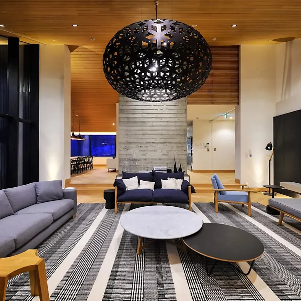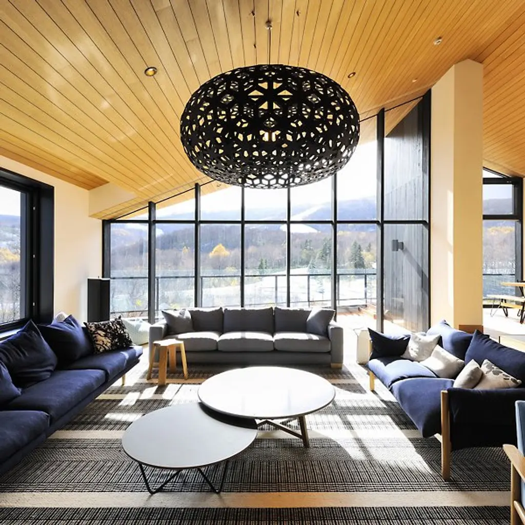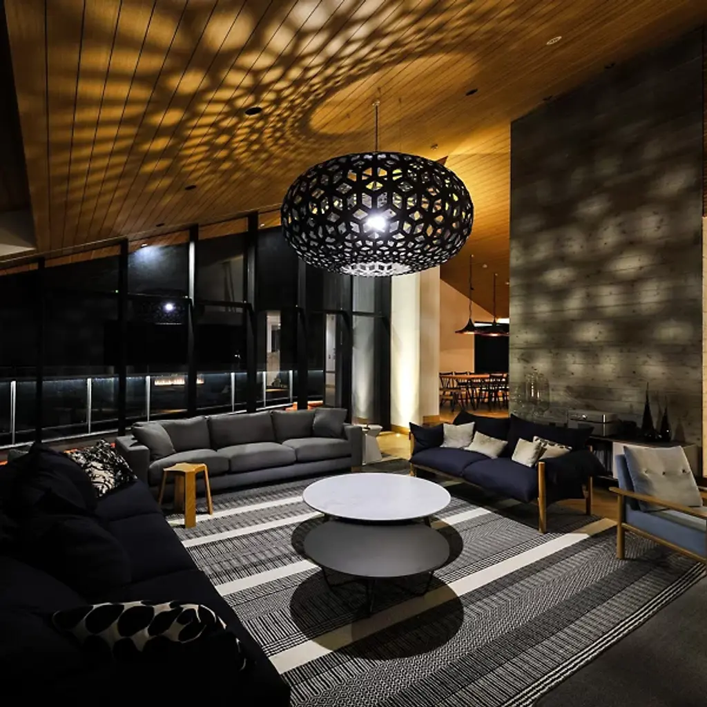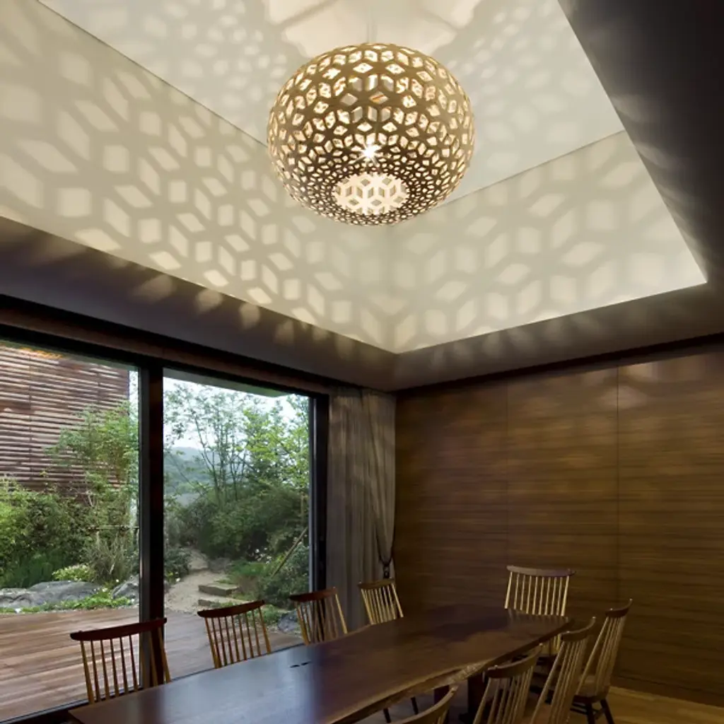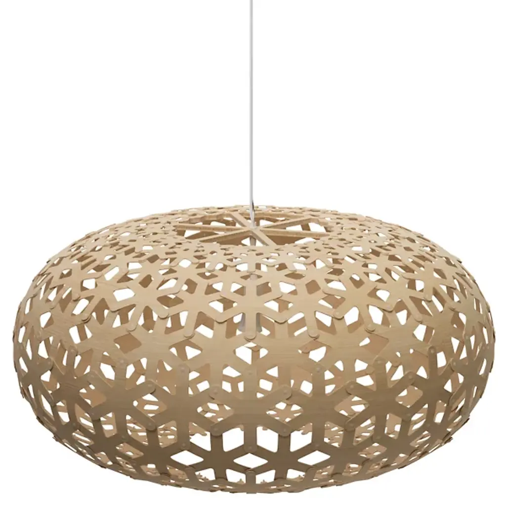 Let it snow. All year long. Designed during an art fellowship in Antartica (of course!), the David Trubridge Snowflake Pendant extends an exquisitely detailed filigreed pattern around the perimeter of its natural wood shade. Constructed from sustainable bamboo, the latticed geometric arrangement results in dazzling flurries of crystalline shadowing around the fixture.