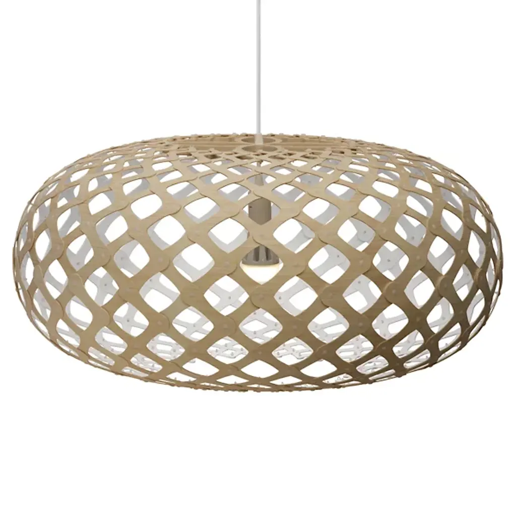 Snowflake was inspired by a journey that designer and naturalist David Trubridge made to Antarctica as a visiting artist from his New Zealand home base. Displaying a repeating geometric hexagonal pattern based on a snowflake, the pendant light is offered in a choice of 3 sizes. Crafted in sustainably sourced thin bamboo plywood, the finish can be all natural or painted, in a ready selection of a stock options. Flat-packed for eco-friendly shipping and easily assembled with push-in nylon clips. Snowflake has been honored with the illustrious Red Dot Award for its winning design.