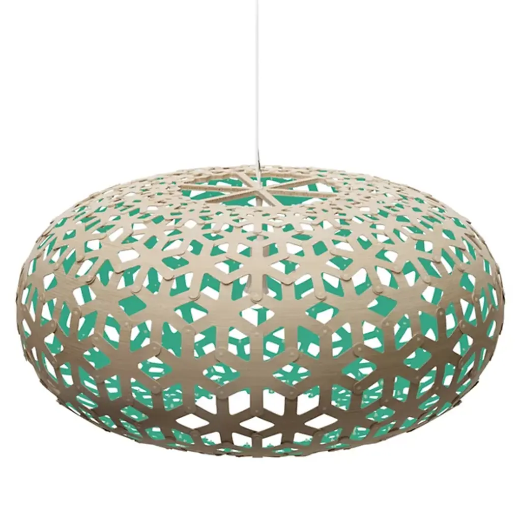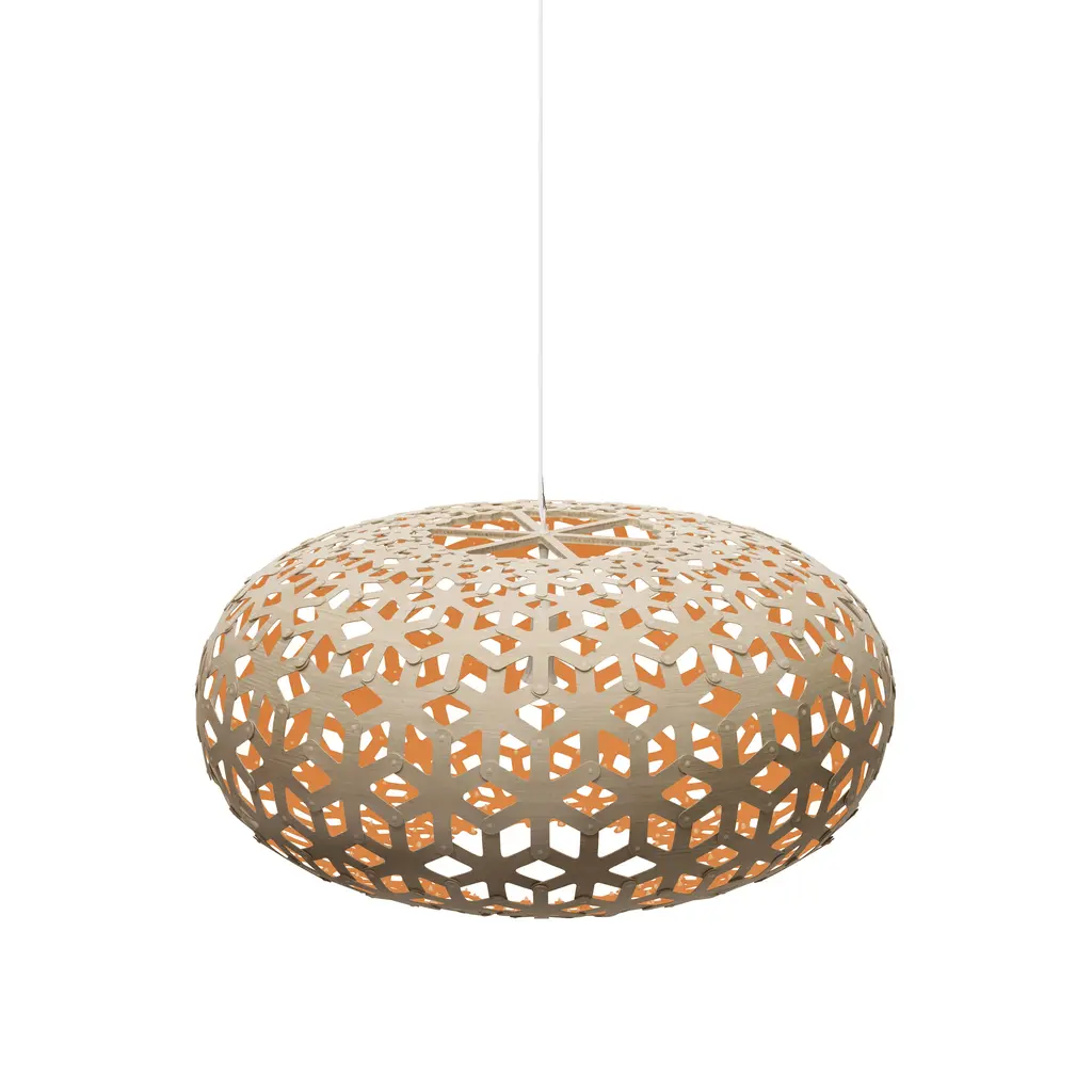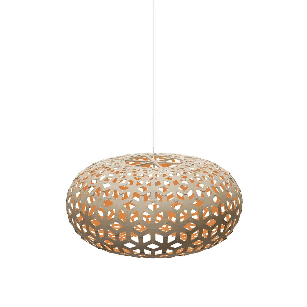 Snowflake was inspired by a journey that designer and naturalist David Trubridge made to Antarctica as a visiting artist from his New Zealand home base. Displaying a repeating geometric hexagonal pattern based on a snowflake, the pendant light is offered in a choice of 3 sizes. Crafted in sustainably sourced thin bamboo plywood, the finish can be all natural or painted, in a ready selection of a stock options. Flat-packed for eco-friendly shipping and easily assembled with push-in nylon clips. Snowflake has been honored with the illustrious Red Dot Award for its winning design.