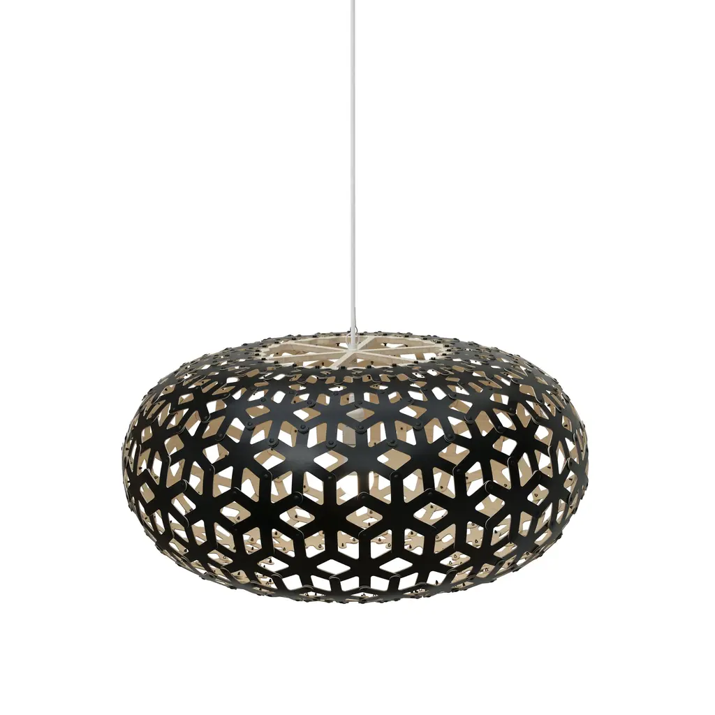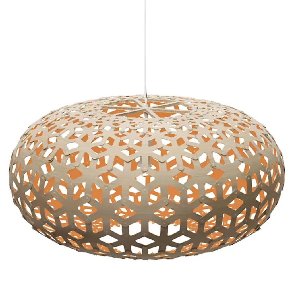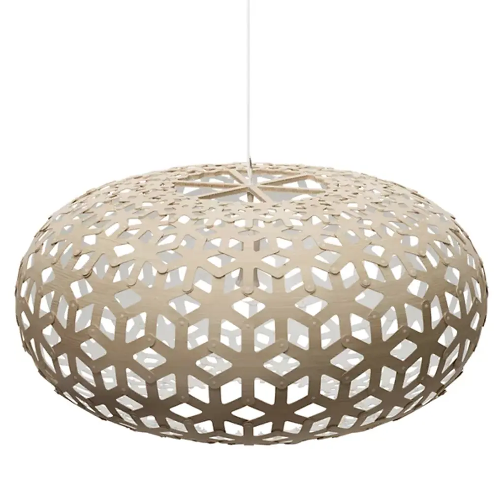 Snowflake was inspired by a journey that designer and naturalist David Trubridge made to Antarctica as a visiting artist from his New Zealand home base. Displaying a repeating geometric hexagonal pattern based on a snowflake, the pendant light is offered in a choice of 3 sizes. Crafted in sustainably sourced thin bamboo plywood, the finish can be all natural or painted, in a ready selection of a stock options. Flat-packed for eco-friendly shipping and easily assembled with push-in nylon clips. Snowflake has been honored with the illustrious Red Dot Award for its winning design.