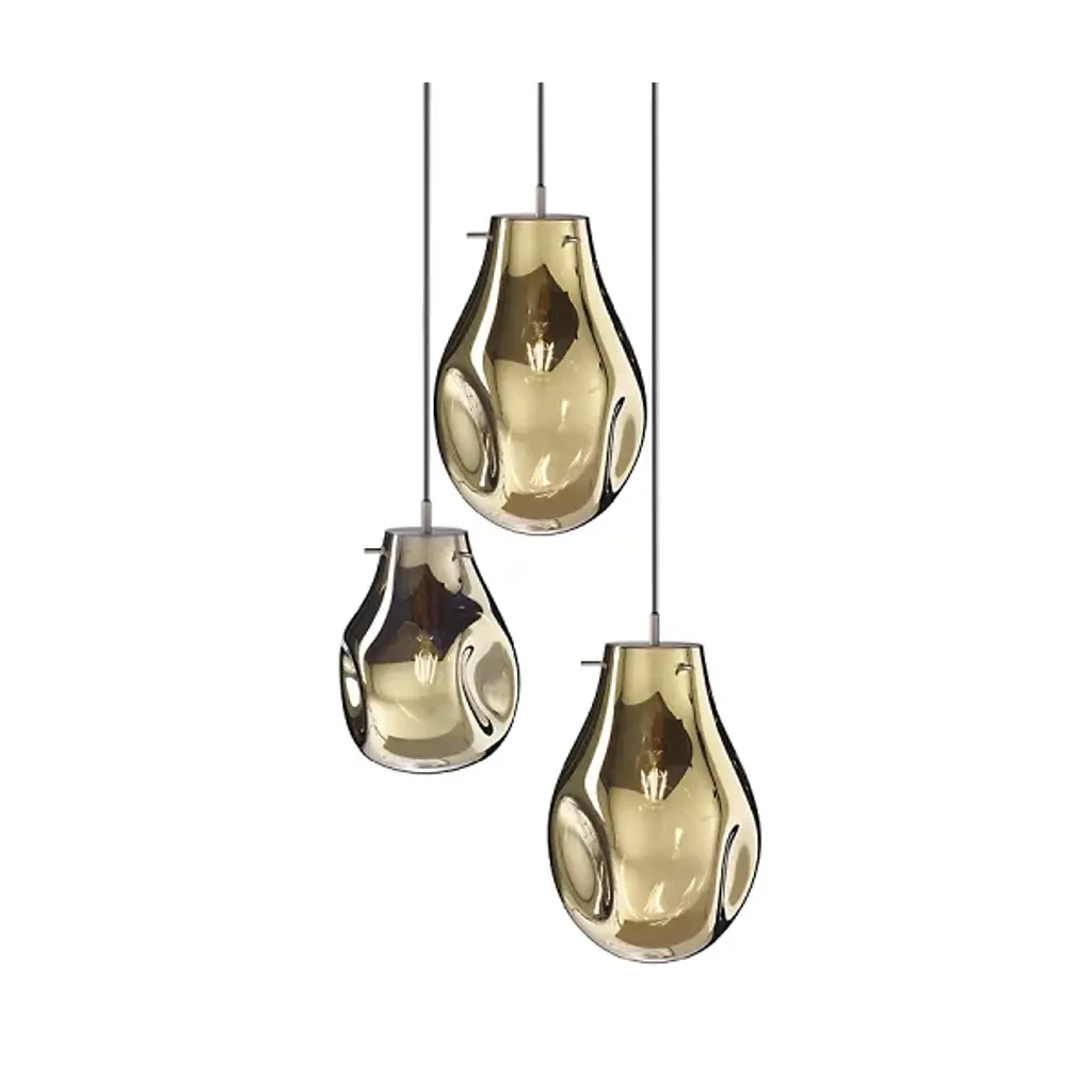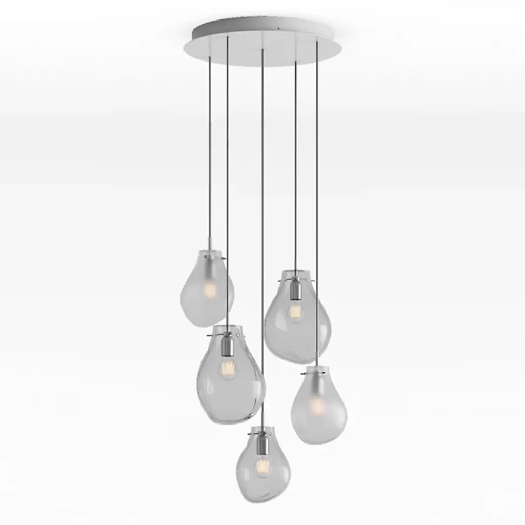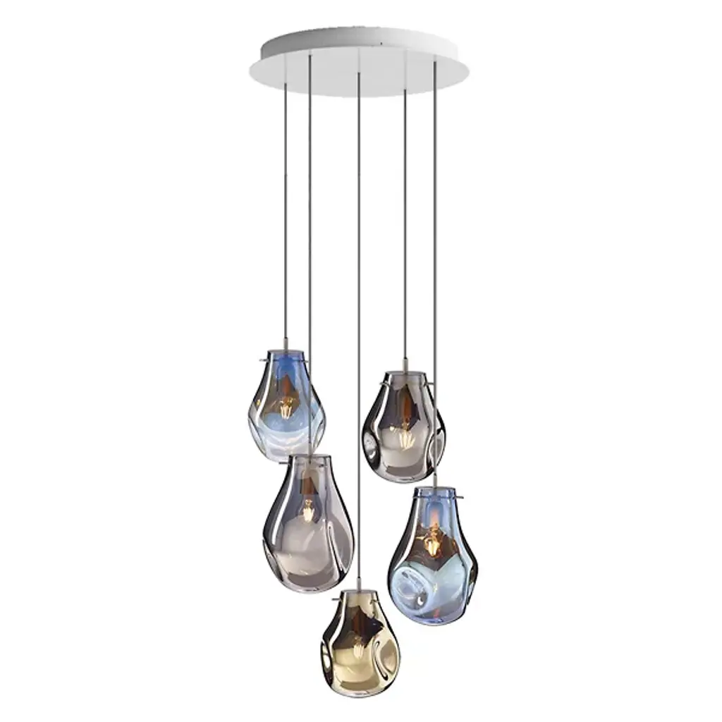 The Soap Pendant from Bomma beautifully mimics the captivating allure of soap bubbles with its varying transparency and fluid shapes. When illuminated, its metallic surface transforms into an enchanting iridescent and translucent display, revealing the crystal within. Each handblown glass droplet is uniquely shaped without a mold, resulting in one-of-a-kind forms and colors. This artistic chandelier adds a mesmerizing glow to any space, serving as a functional light source and a stunning decorative centerpiece, truly elevating any room.