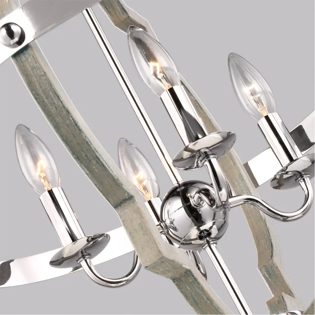 The Socorro four-light indoor bohemian style pendant offered in a hand-painted dark weathered grey or washed pine and chrome finish features a modern take on this timeless industrial beauty. The decorative silhouette of barbed Quatrefoil profile combines a distressed oak finish with metal sockets and decorative strapping to create undeniable rustic charm. A candelabra-style bulb can add charm, and make an ambient light fixture statement in your kitchen or dining room. The by Generation Lighting has been an industry leader since 1919.