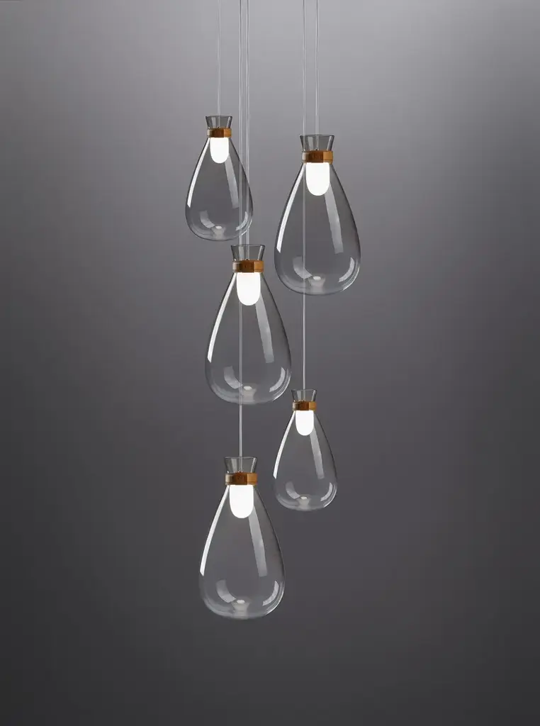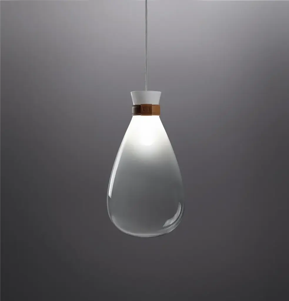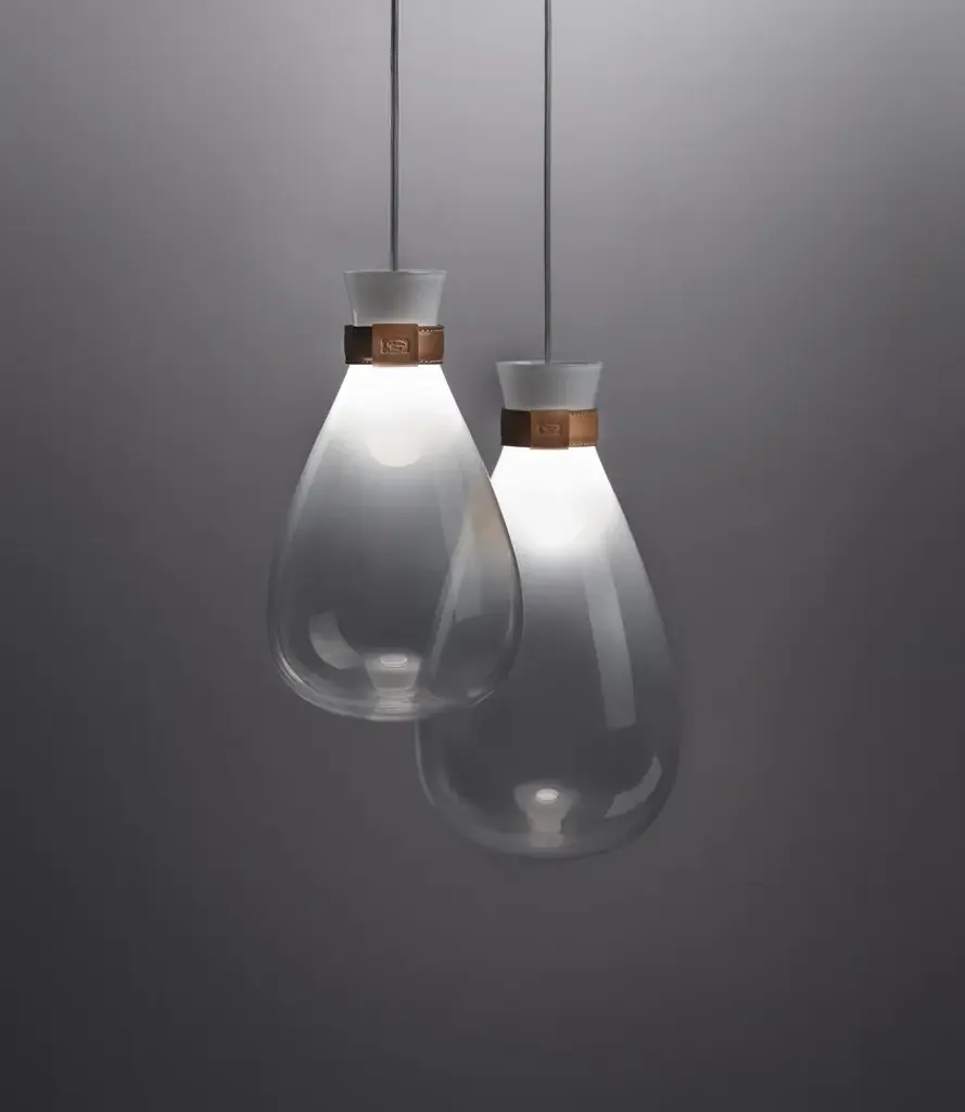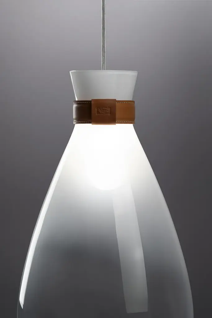 Soffi. The purity of light and glass blown by Venice's master craftsmen. The minimalistic design of GamFratesi captures the exact moment when the blowing technique gives the glass its shape. Delicate and irregular globes seem to float out of a slender leather arm suspended in the air by the force of gravity. The project is inspired by an ancient art translated into a simple yet contemporary language. The Soffi lamps are composed of two elements in blown glass. The outer globe, ephemeral and almost weightless, is in faded tones of milk-white or smoky grey. The globe holding the light, in blown glass in an opaque white etched finish, is solider visually. When lit, the lamp blossoms with an even and diffused light, which enhances the faded tones of the outer glass and its gradual transparency. The magical and harmonious effect can be used to light various different settings, made even more evocative by the unique nature of each Soffi lamp, with subtle differences in tone and irregular shapes created by blowing different colours of glass. The lamps are available in three sizes, small, medium and large, which can be arranged in a range of configurations. As well as an individual lamp, the design can also be arranged in linear compositions of three globes or hanging arrangements with three or five globes. The arm is enhanced with Cuoio Saddle Extra leather, available in Camel or Taupe, with contrasting stitching and a dyed tone-on-tone trim. A leather buckle hides the join. The Poltrona Frau logo is heat-stamped onto the arm. All internal metal parts feature a natural brass finish. The steel rosettes are painted white with transparent adjustable cables.