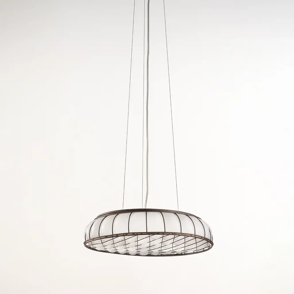 This striking ceiling lamp is modern and elegant and will make a statement in any decor. Its structure is in bronzed steel that creates a grid onto which the white Murano glass is mouth-blown generating a unique effect that resembles a multitude of bubbles enclosed in a grid. This modern interpretation of the traditional Venetian lantern was entirely handmade. Contract and commercial certifications available upon request. Lightbulbs not inlcuded. Due to handcrafting, slight changes in metal's finish may occur.