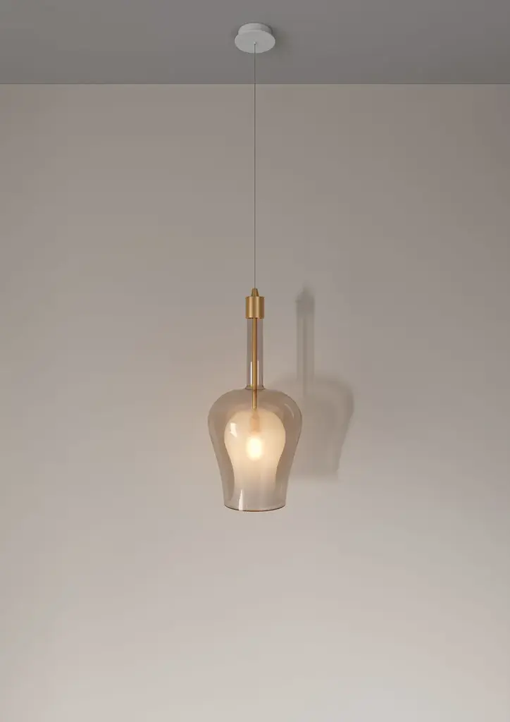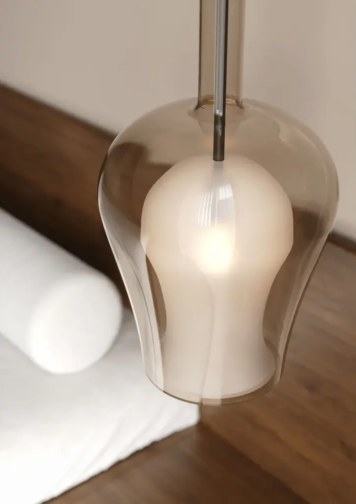 Soffio is a pendant lamp made of borosilicate glass. It takes the magical breath of a master glassmaker to craft its unique double glass design an inner and an outer layer bringing to life an extraordinary and distinctive piece. The combination of a frosted inner glass and a transparent or smoked outer glass creates striking light effects in the surrounding space, adding a touch of elegance and sophistication to any environment.