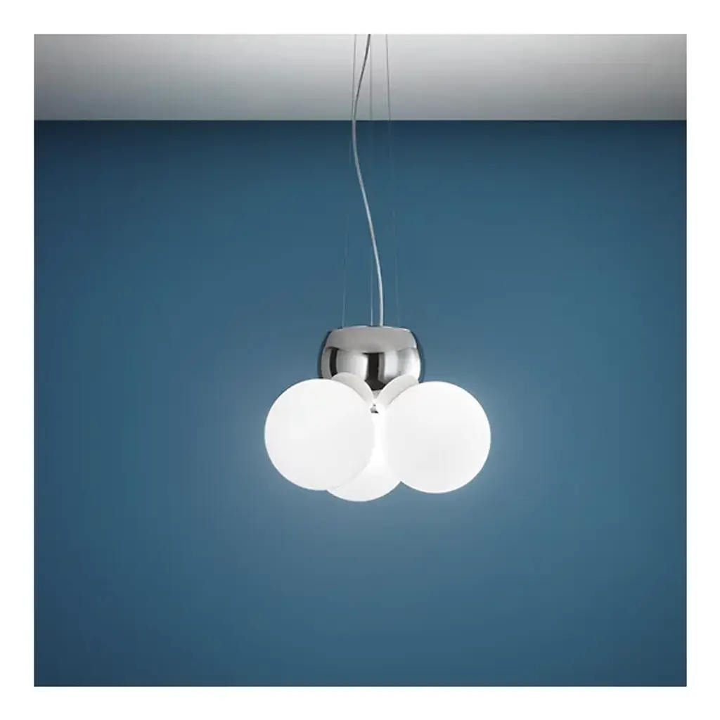 Add a soothing layer of light to the favorite spaces in your modern home with the Soft Pendant from Itama. Simple yet unique, this piece hangs from the ceiling by way of a set of thin wires that lead directly to a smooth and shining metal orb. The orb mounts a set of three frosted white-blown glass spheres that each contain a single bulb. The light from the bulbs diffuses in a clean and welcoming manner, bringing the shades to life with a soft demonstration of light.