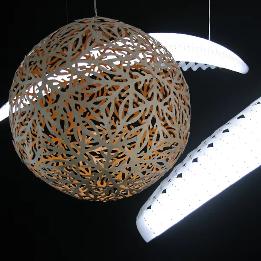 The Sola Pendant from David Trubridge enriches interiors with an intense, intricate interplay of light and shadow. Designed in New Zealand by Trubridge, its spherical structure is composed of slender bamboo plywood segments that interlock into a decorative shell of frond-like extensions. Originating from the Trubridge’s ‘Icarus’ installation shown in Milan in 2010, the piece evokes the myth of flight. The light within projects a vivid, swirling pattern across surrounding surfaces with the drama of solar flares, balancing organic presence with bold, luminous light.