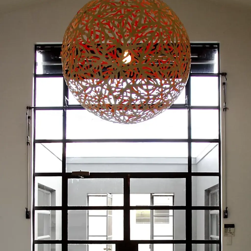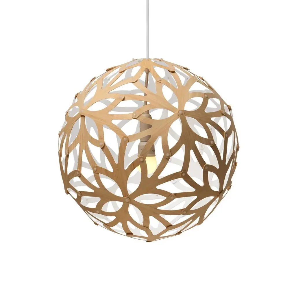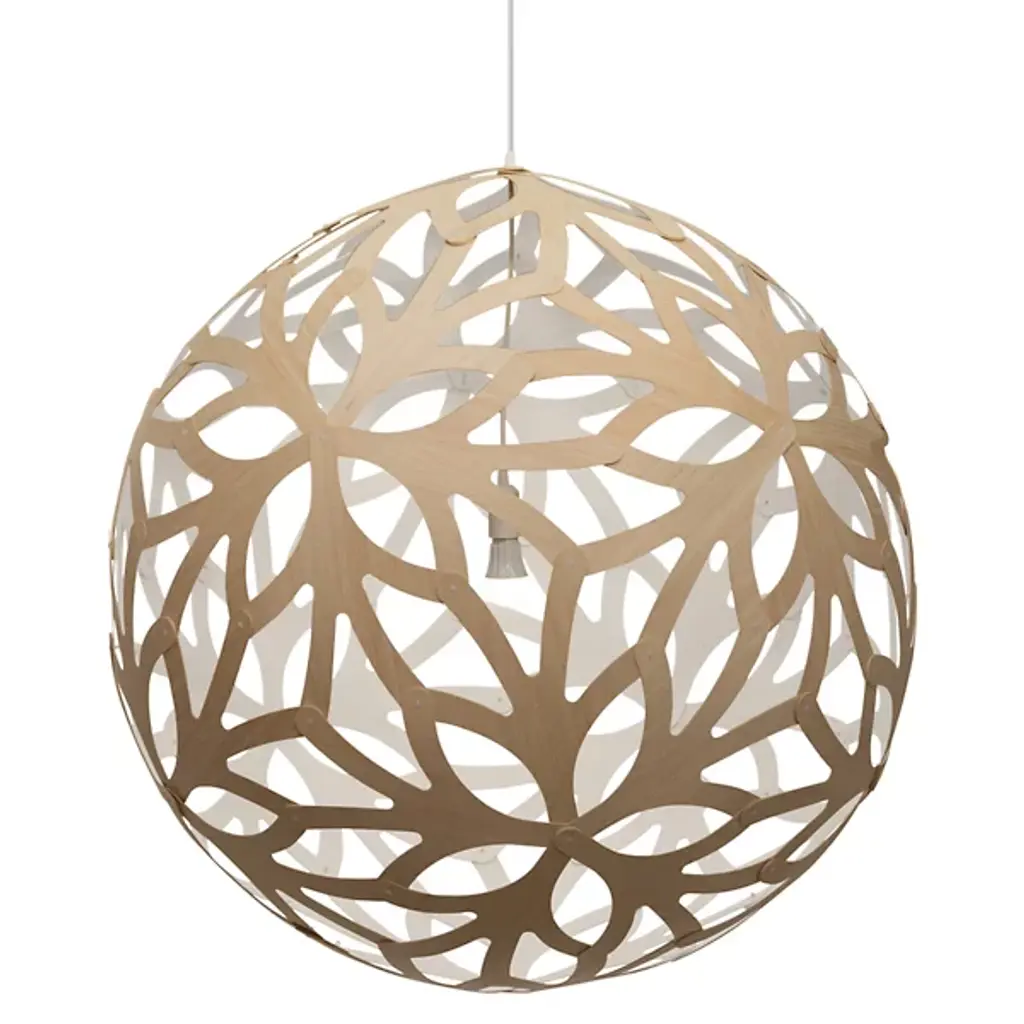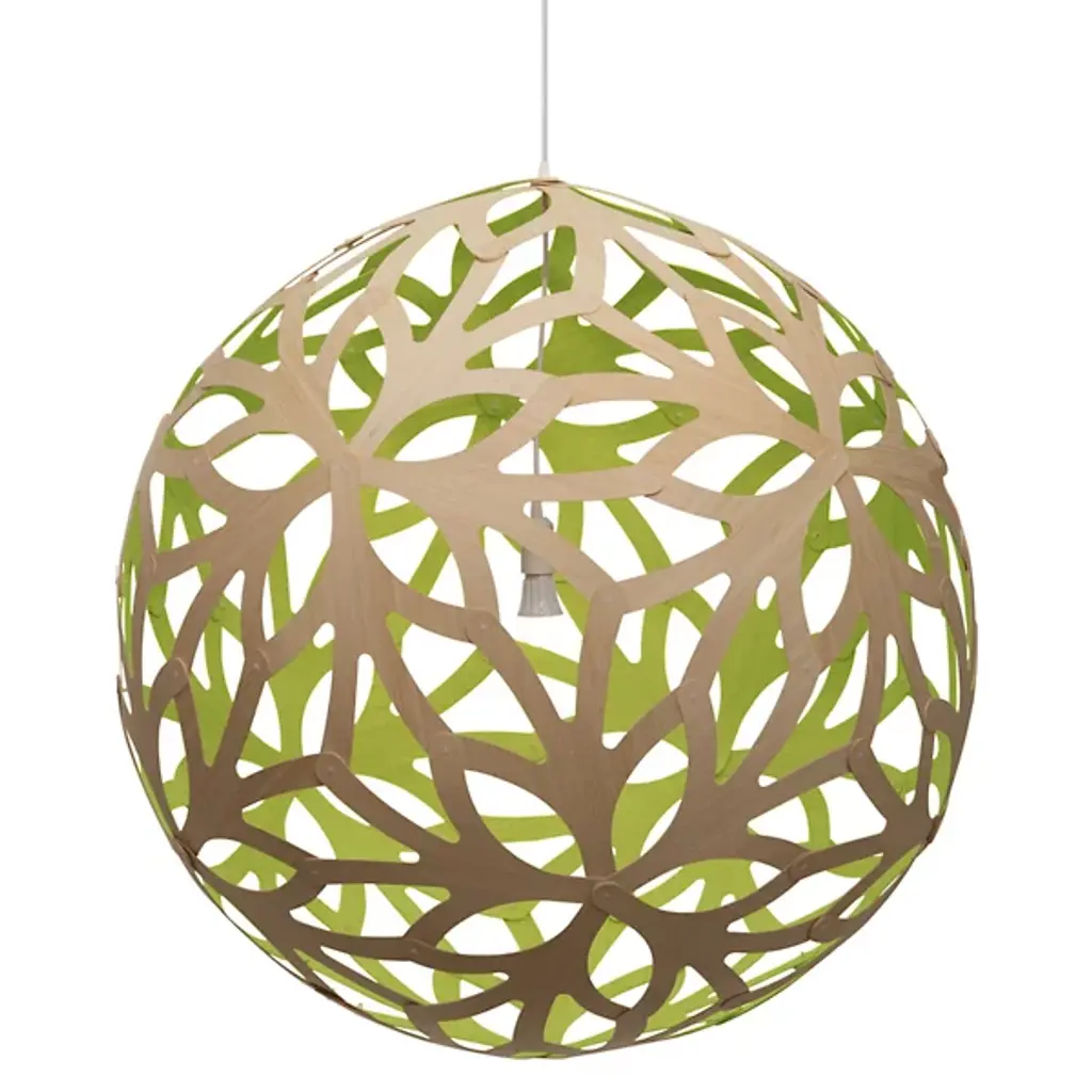 The Sola Pendant from David Trubridge enriches interiors with an intense, intricate interplay of light and shadow. Designed in New Zealand by Trubridge, its spherical structure is composed of slender bamboo plywood segments that interlock into a decorative shell of frond-like extensions. Originating from the Trubridge’s ‘Icarus’ installation shown in Milan in 2010, the piece evokes the myth of flight. The light within projects a vivid, swirling pattern across surrounding surfaces with the drama of solar flares, balancing organic presence with bold, luminous light.