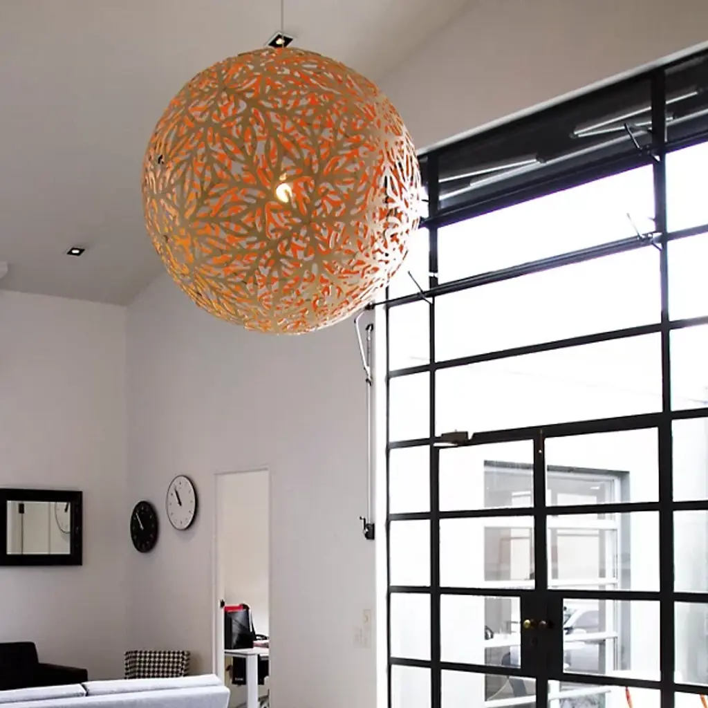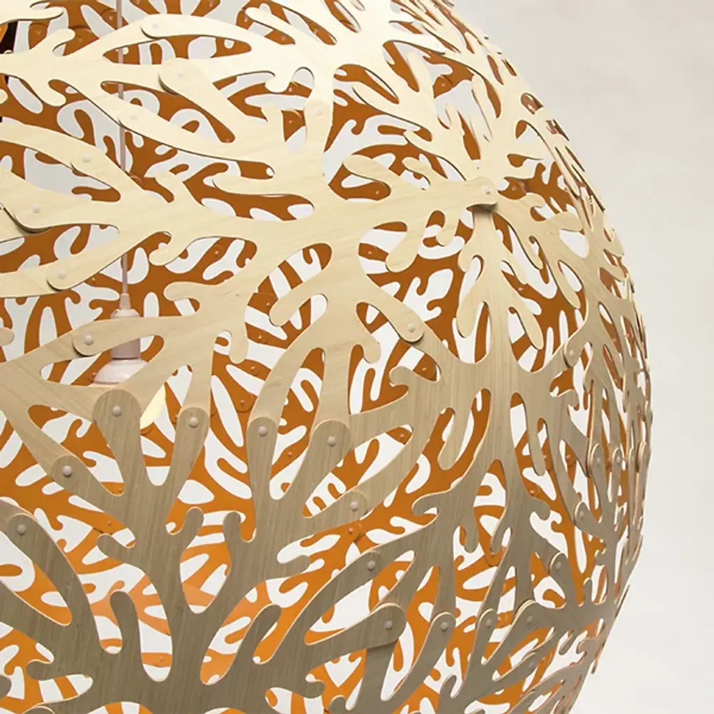 The Sola Pendant from David Trubridge enriches interiors with an intense, intricate interplay of light and shadow. Designed in New Zealand by Trubridge, its spherical structure is composed of slender bamboo plywood segments that interlock into a decorative shell of frond-like extensions. Originating from the Trubridge’s ‘Icarus’ installation shown in Milan in 2010, the piece evokes the myth of flight. The light within projects a vivid, swirling pattern across surrounding surfaces with the drama of solar flares, balancing organic presence with bold, luminous light.