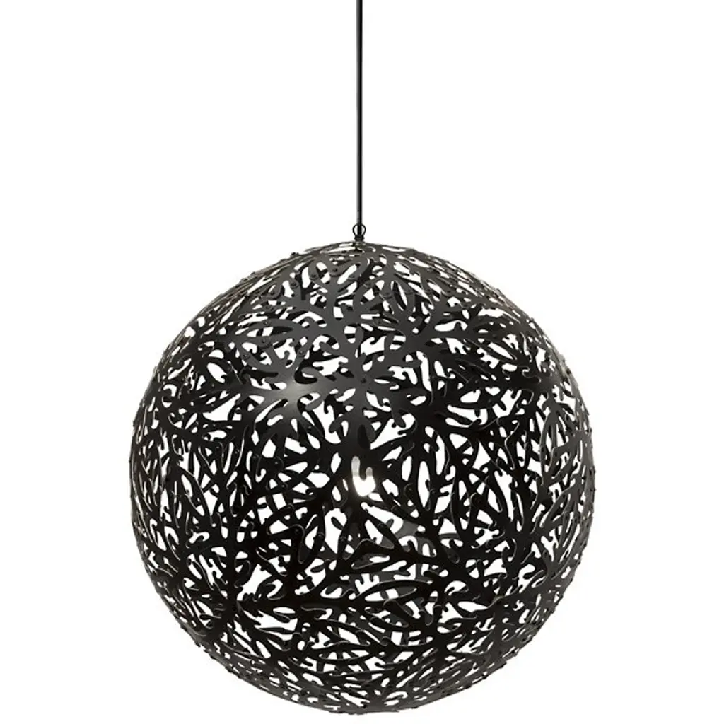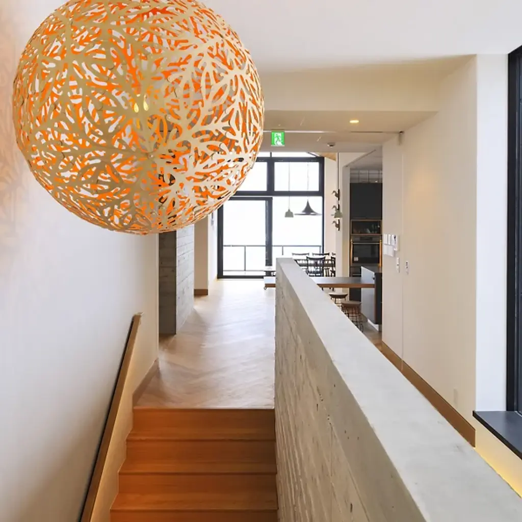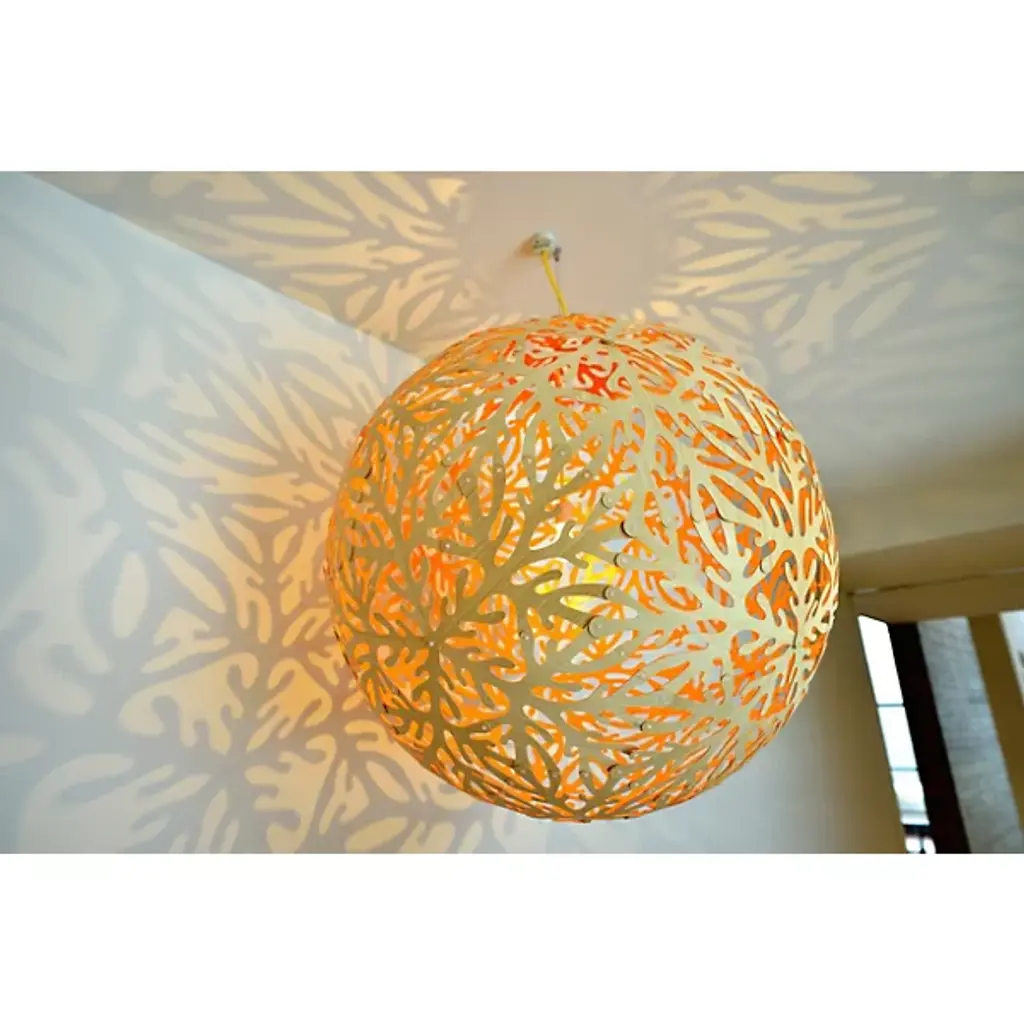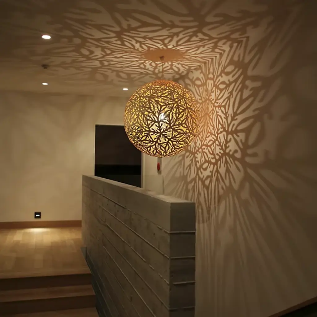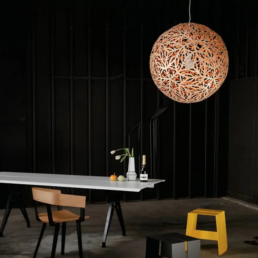 The Sola Pendant from David Trubridge enriches interiors with an intense, intricate interplay of light and shadow. Designed in New Zealand by Trubridge, its spherical structure is composed of slender bamboo plywood segments that interlock into a decorative shell of frond-like extensions. Originating from the Trubridge’s ‘Icarus’ installation shown in Milan in 2010, the piece evokes the myth of flight. The light within projects a vivid, swirling pattern across surrounding surfaces with the drama of solar flares, balancing organic presence with bold, luminous light.