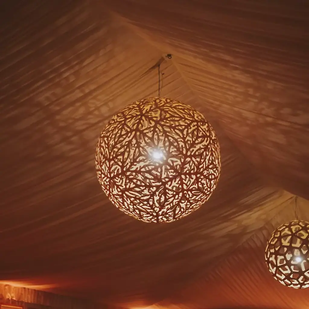 The Sola Pendant from David Trubridge enriches interiors with an intense, intricate interplay of light and shadow. Designed in New Zealand by Trubridge, its spherical structure is composed of slender bamboo plywood segments that interlock into a decorative shell of frond-like extensions. Originating from the Trubridge’s ‘Icarus’ installation shown in Milan in 2010, the piece evokes the myth of flight. The light within projects a vivid, swirling pattern across surrounding surfaces with the drama of solar flares, balancing organic presence with bold, luminous light.