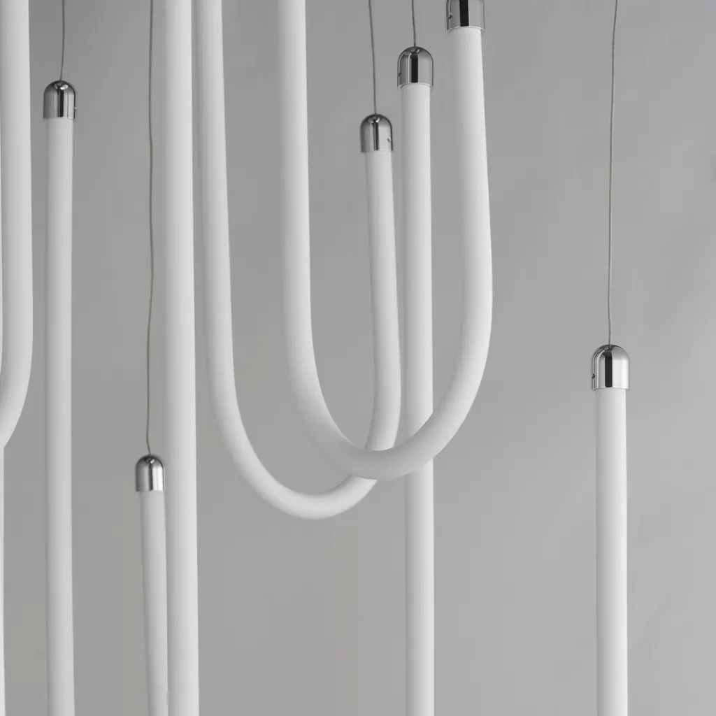 Sweeping matte white acrylic tubes encase an omnidirectional LED light source, arranged in abstract configurations inspired by solar flares. Minimal in composition yet dramatic in form, the Soleil collection offers a striking lighting solution. Available in a range of sizes, including fixed flush mount and field-adjustable pendant configurations, Soleil is offered in Polished Chrome, Matte Black, and Natural Aged Brass, making it a perfect complement to a variety of interior color schemes.