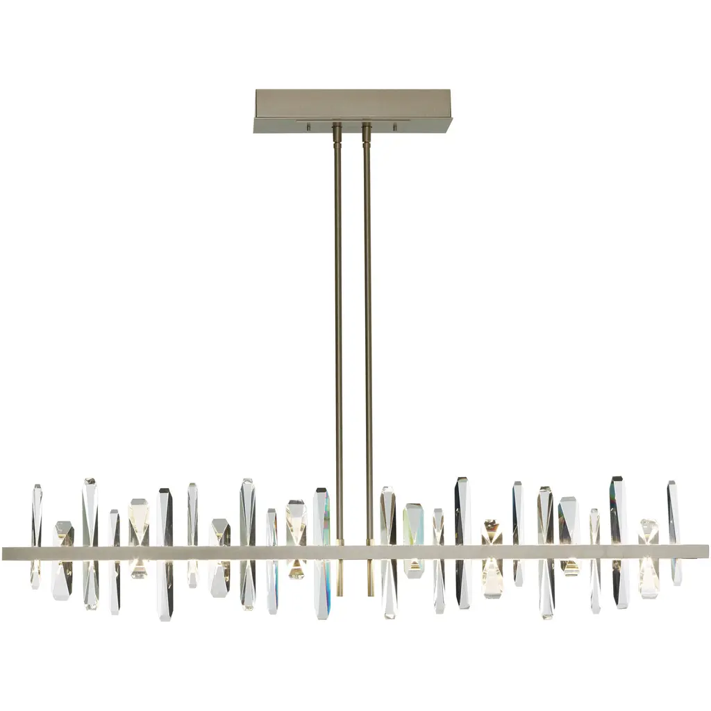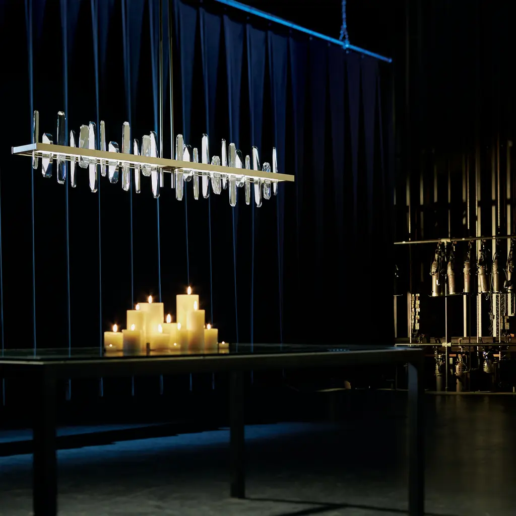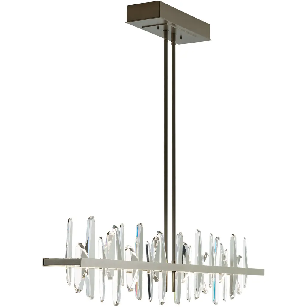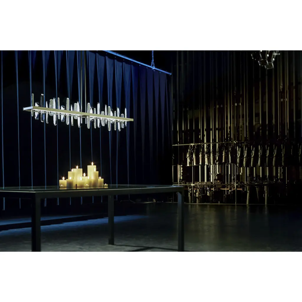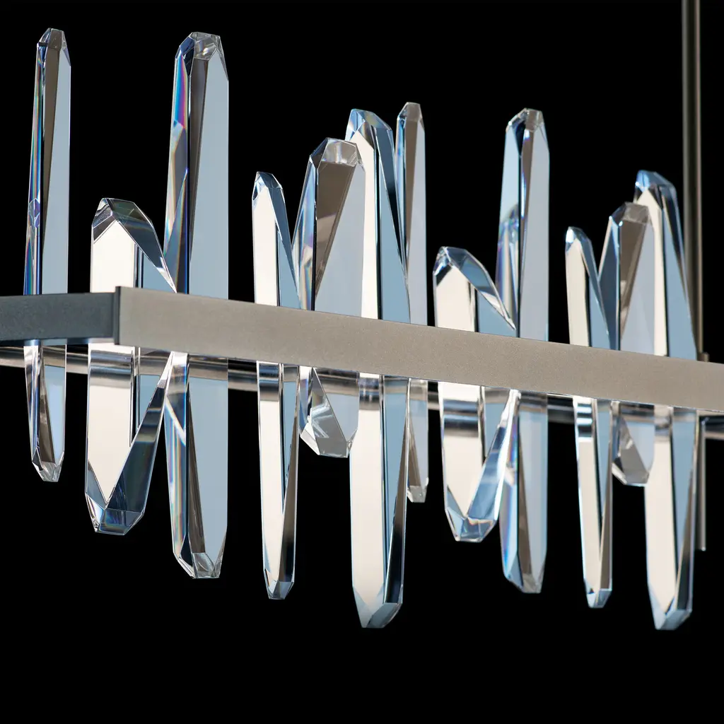 A floating island of angular crystal towers provides the visual aesthetics for this distinctive pendant. Each crystal rises from an LED light guide and pierces through to emerge below, reflecting and refracting light in a vibrant sparkle.