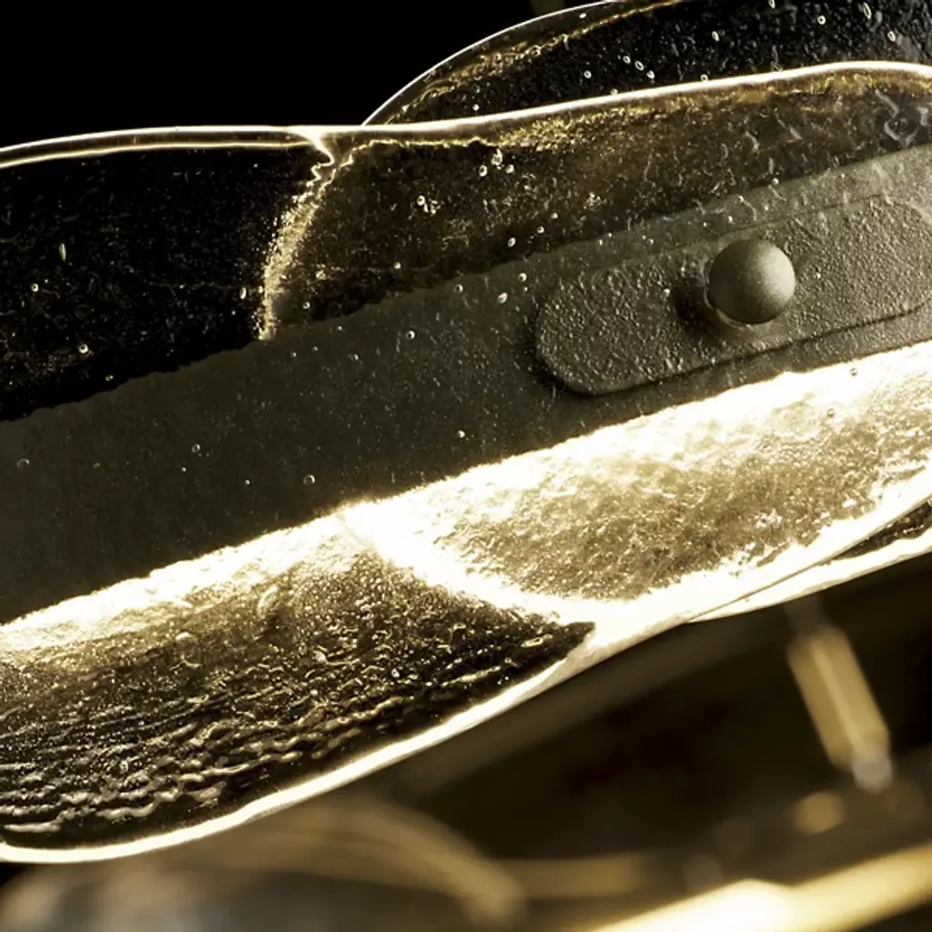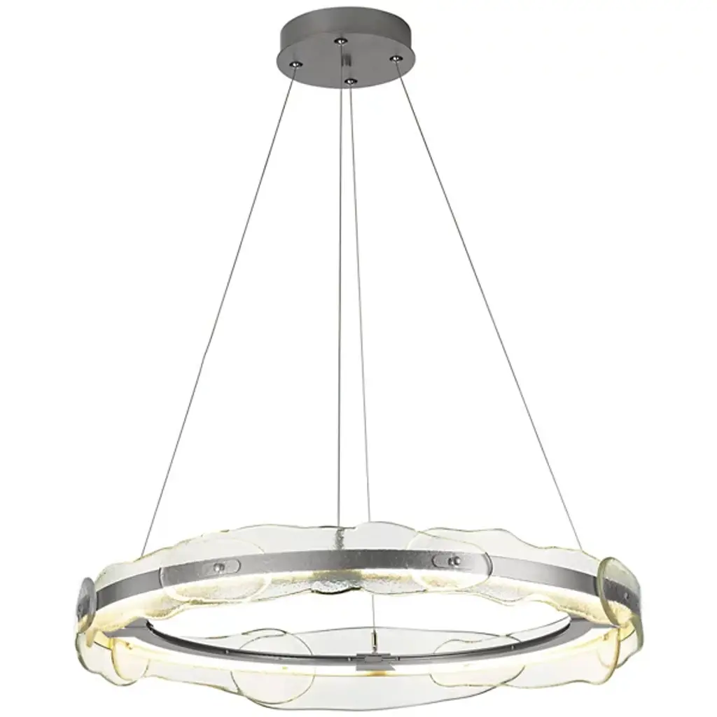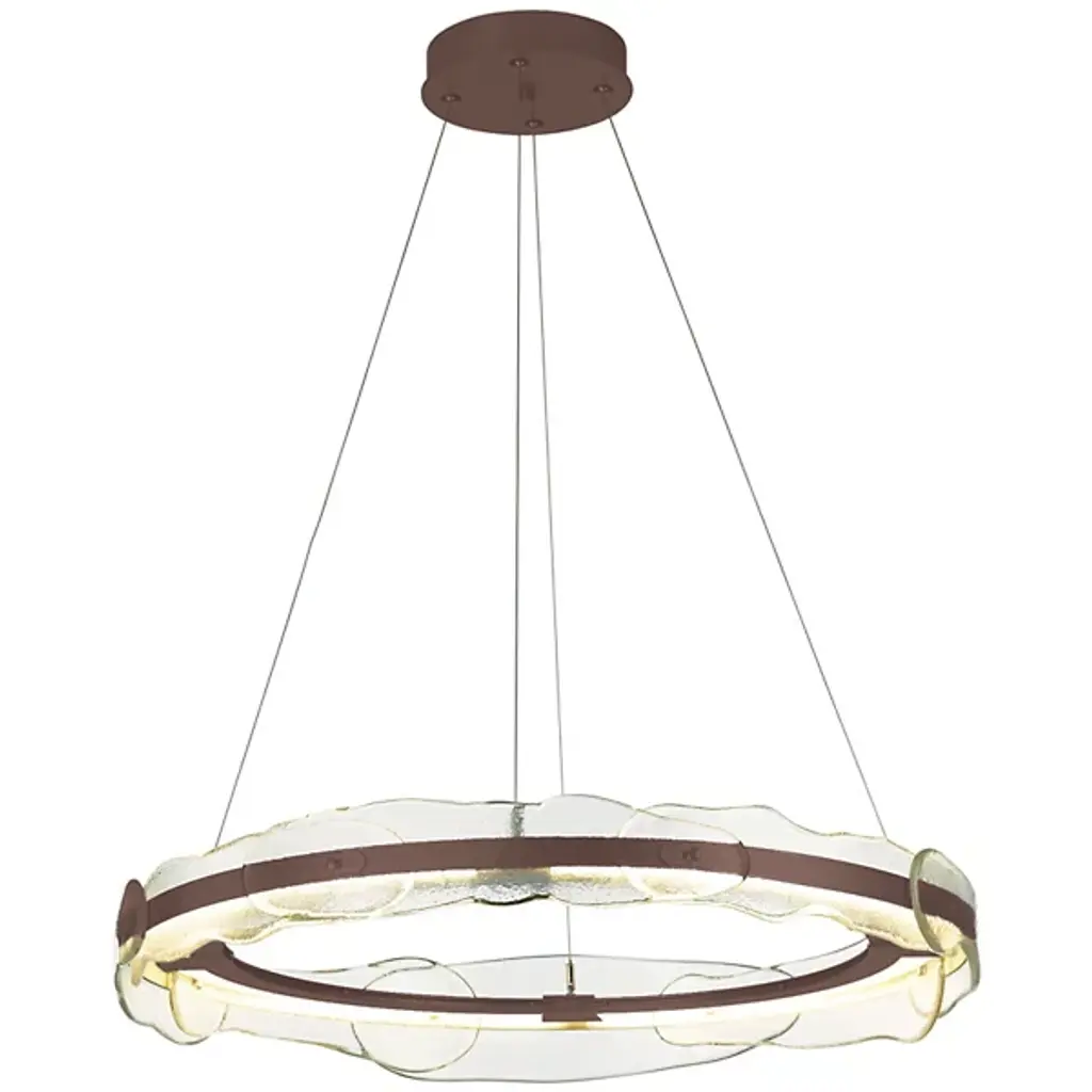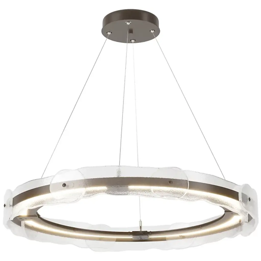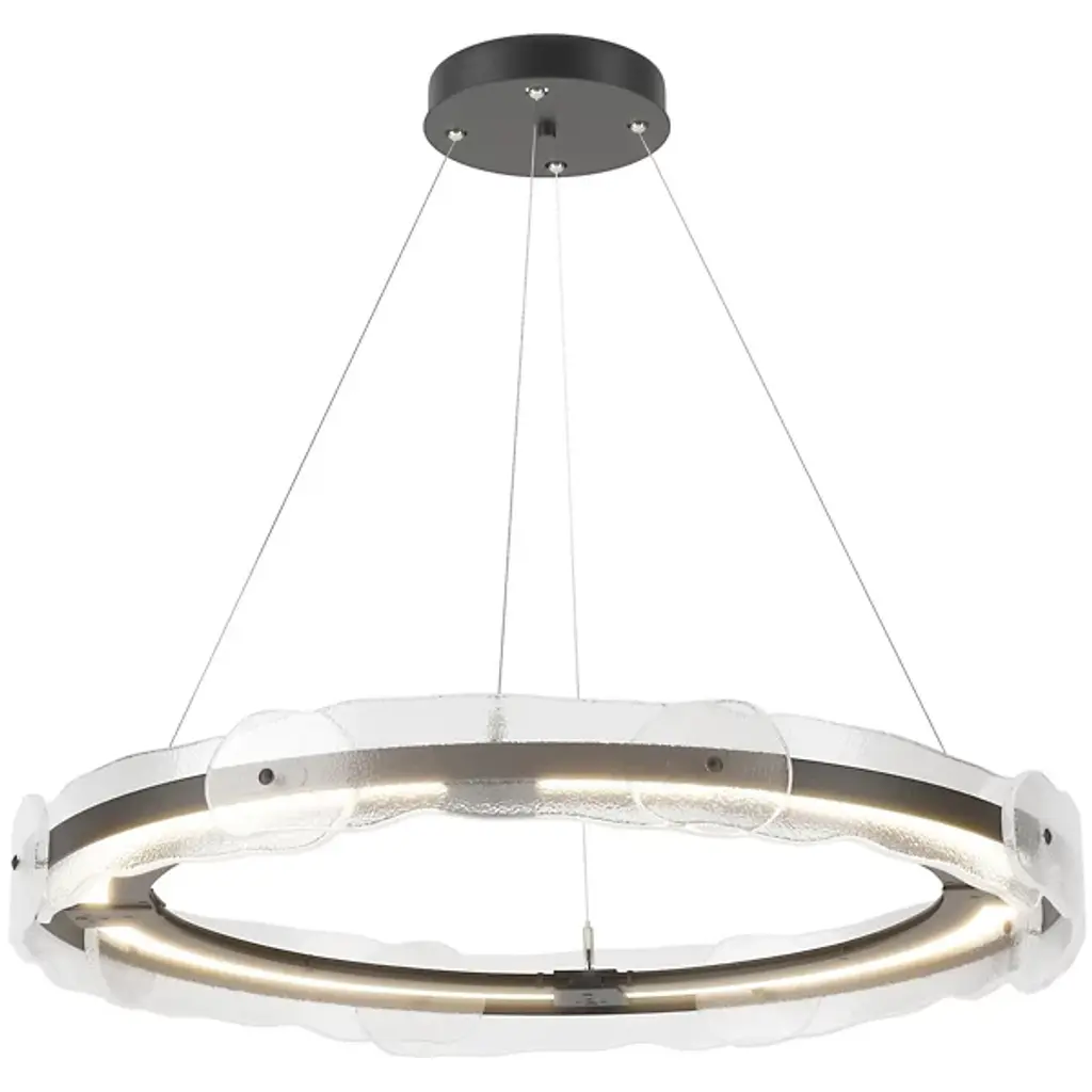With its sleek, minimalist form and handmade textured glass, the Solstice LED Pendant by Hubbardton Forge brings an unforgettable presence to your living space. Its ringed form features a sleek metal frame (with knobbed accents) that is sensually surrounded by free-floating, transparent glass. Its interior is lined with an integrated LED light source which provides a warm, even ambiance appropriate for residential and commercial settings.