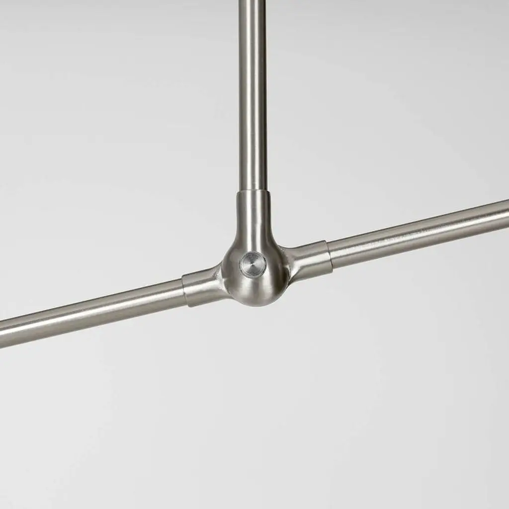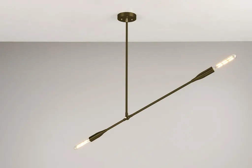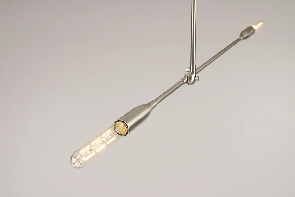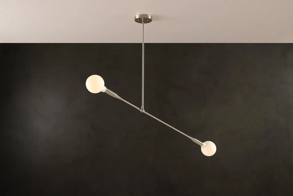 The Sorenthia Light is a modern, linear pendant with bold, elegant lines and dramatic negative space. The custom-made light fixture incorporates an element of the organic in its design language with a long, reaching arm that can be adjusted on site, allowing for a wide range of angles and orientations. Versatile and dynamic, this statement piece adds a contemporary design element to your space.Bulbs sold separately.Customers can choose from:- Black Poppy with Brass or Nickel Details- Brushed Nickel (+$640)- Brushed Brass (+$640)- Oil Rubbed Brass (+$640)Studio DUNN's designs are influenced by a Mid-Century Modern aesthetic with a fresh, contemporary perspective. Designer and studio owner Asher Rodriquez-Dunn also draws from nature for his inspiration; the Sorenthia Lights are inspired by shimmering branches of sea kelp.The elegant arms of the Sorenthia are comprised of a combination of custom cast, machined and spun metal pieces. A local metallurgist plates or powder coats the parts, after which they return to our studio where they are assembled to our standard dimensions or your custom configurations. We use only the finest materials in our handcrafted pieces. It is our philosophy to deliver products that reflect our commitment to nature, craftsmanship, and good design, letting you indulge in your DUNN pieces for many years to come.Dimensions:Canopy: 5 in diameter x 1 in H.Standard drop rod: 24 in.Lighting arm: 38 in. (NOT including bulbs on either end)4 lbs.Overall dimensions will vary based on the positioning of the articulating lighting arm. Custom drop rod dimensions are available (fees may apply).Details include canopy end caps, joint screw caps, hang straight.Custom plated and powder coated finishes are available (fees may apply).Bulbs sold separately. Please inquire if you would like to select from our options of high-quality LED bulbs and include pricing on your invoice.Clients may also provide own E26 base bulbs.UL and cUL certified and labeled.