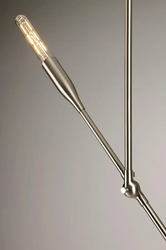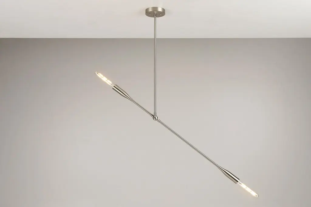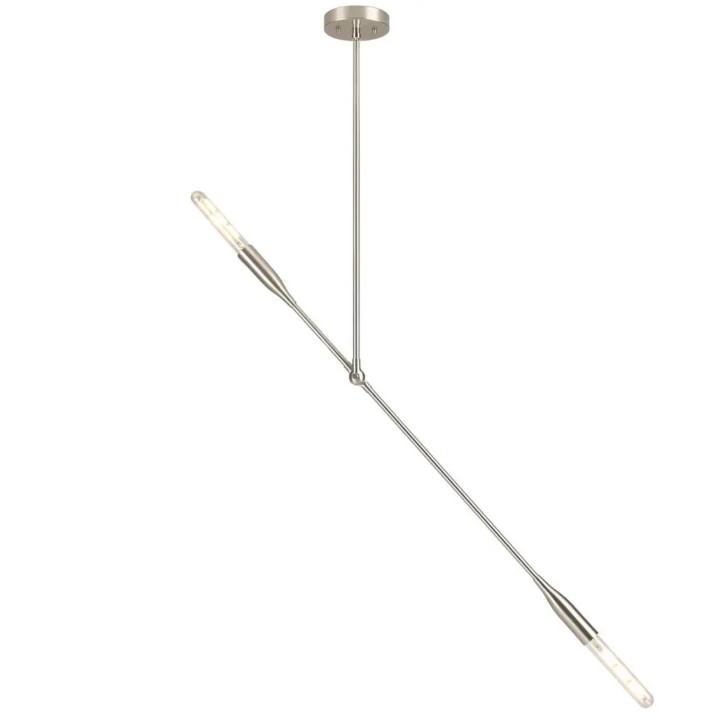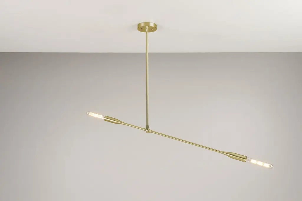 The Sorenthia Light is a modern, linear pendant with bold, elegant lines and dramatic negative space. The custom-made light fixture incorporates an element of the organic in its design language with a long, reaching arm that can be adjusted on site, allowing for a wide range of angles and orientations. Versatile and dynamic, this statement piece adds a contemporary design element to your space.Bulbs sold separately.Customers can choose from:- Black Poppy with Brass or Nickel Details- Brushed Nickel (+$640)- Brushed Brass (+$640)- Oil Rubbed Brass (+$640)Studio DUNN's designs are influenced by a Mid-Century Modern aesthetic with a fresh, contemporary perspective. Designer and studio owner Asher Rodriquez-Dunn also draws from nature for his inspiration; the Sorenthia Lights are inspired by shimmering branches of sea kelp.The elegant arms of the Sorenthia are comprised of a combination of custom cast, machined and spun metal pieces. A local metallurgist plates or powder coats the parts, after which they return to our studio where they are assembled to our standard dimensions or your custom configurations. We use only the finest materials in our handcrafted pieces. It is our philosophy to deliver products that reflect our commitment to nature, craftsmanship, and good design, letting you indulge in your DUNN pieces for many years to come.Dimensions:Canopy: 5 in diameter x 1 in H.Standard drop rod: 24 in.Lighting arm: 38 in. (NOT including bulbs on either end)4 lbs.Overall dimensions will vary based on the positioning of the articulating lighting arm. Custom drop rod dimensions are available (fees may apply).Details include canopy end caps, joint screw caps, hang straight.Custom plated and powder coated finishes are available (fees may apply).Bulbs sold separately. Please inquire if you would like to select from our options of high-quality LED bulbs and include pricing on your invoice.Clients may also provide own E26 base bulbs.UL and cUL certified and labeled.