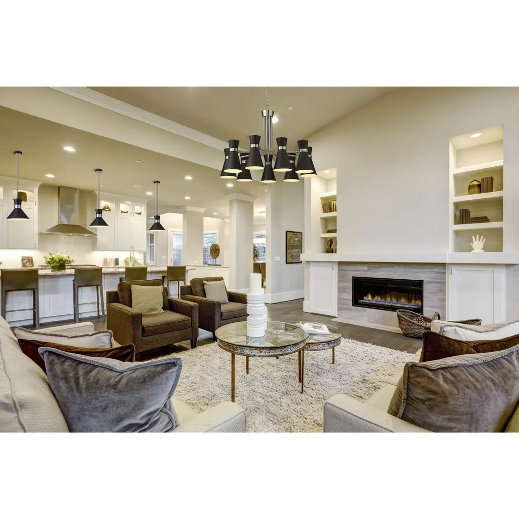 A decorative silhouette shapes industrial influence that adds casual elegance to this matte black finish metal pendant light. Dress up a main living space or entryway with this tasteful fixture trimmed with brushed nickel finish steel. This sleek pendant captures the heart of romantic industrial charm.
