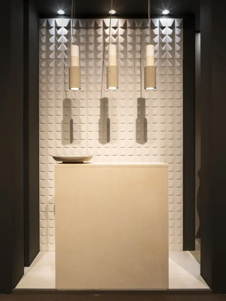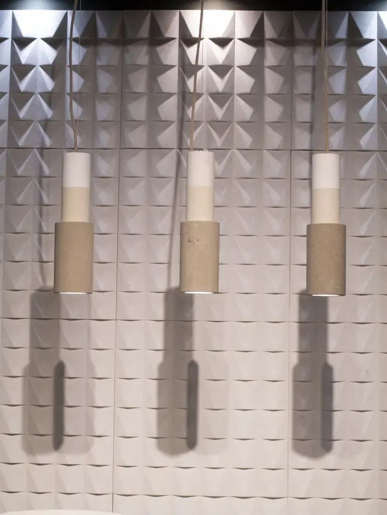 The Sospese pendant lamp collection – designed by gumdesign – features multiple shapes derived from a simple cylinder made of three overlapping elements. These shapes transform with subtle design modifications at the end of the lighting fixture, allowing light to diffuse more or less across the horizontal plane below.