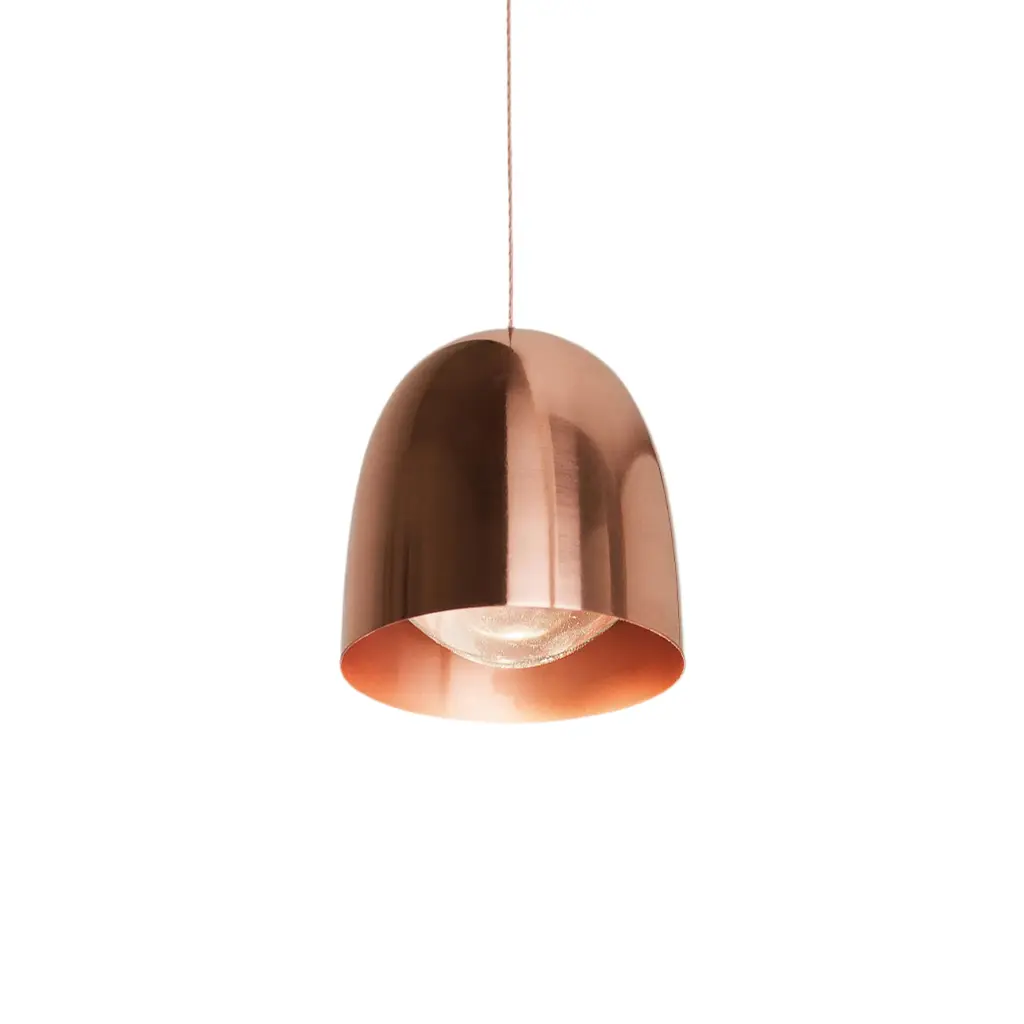 Suspension lamp system crafted in copper or brass. Features a high-luminance Floor Lamp light source. It includes a glass lens that focuses the light and enhances its luminous efficiency. An optional opal diffuser provides dispersed lighting. Features