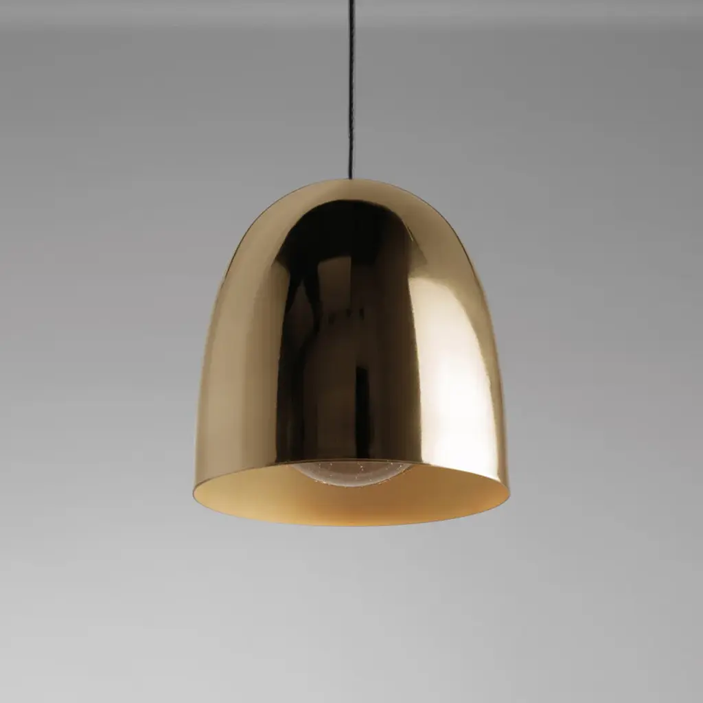 Suspension lamp system crafted in copper or brass. Features a high-luminance Floor Lamp light source. It includes a glass lens that focuses the light and enhances its luminous efficiency. An optional opal diffuser provides dispersed lighting. Features
