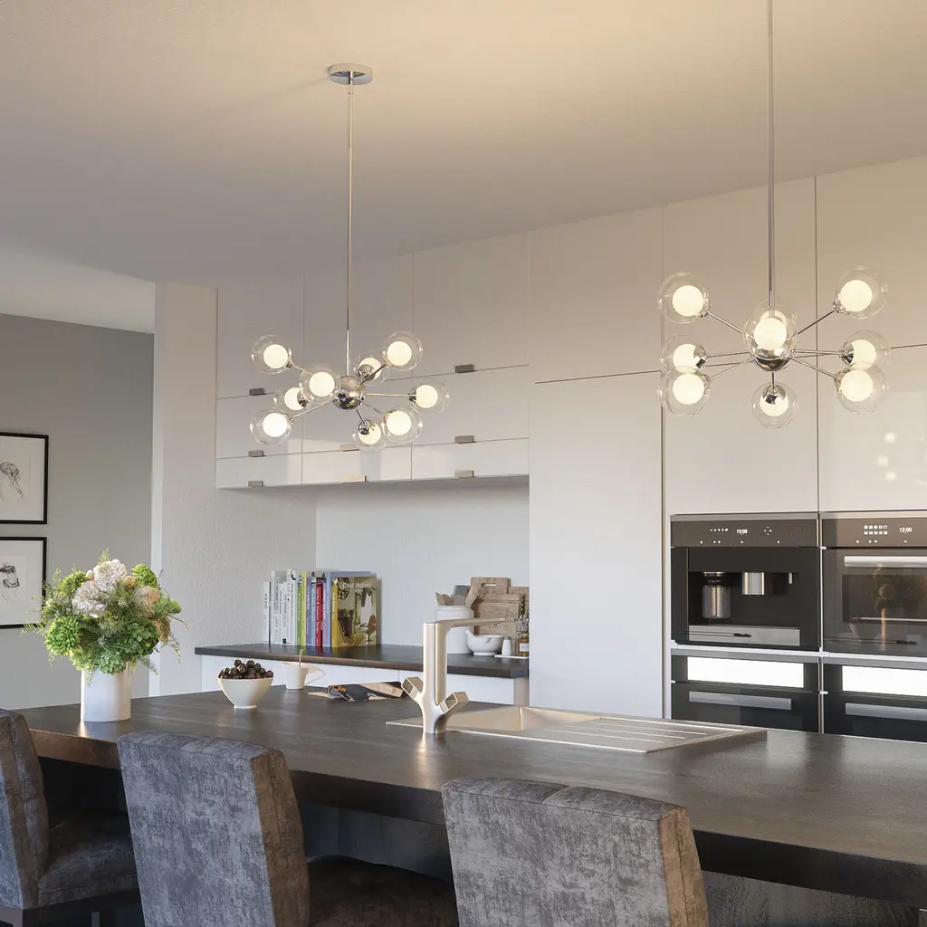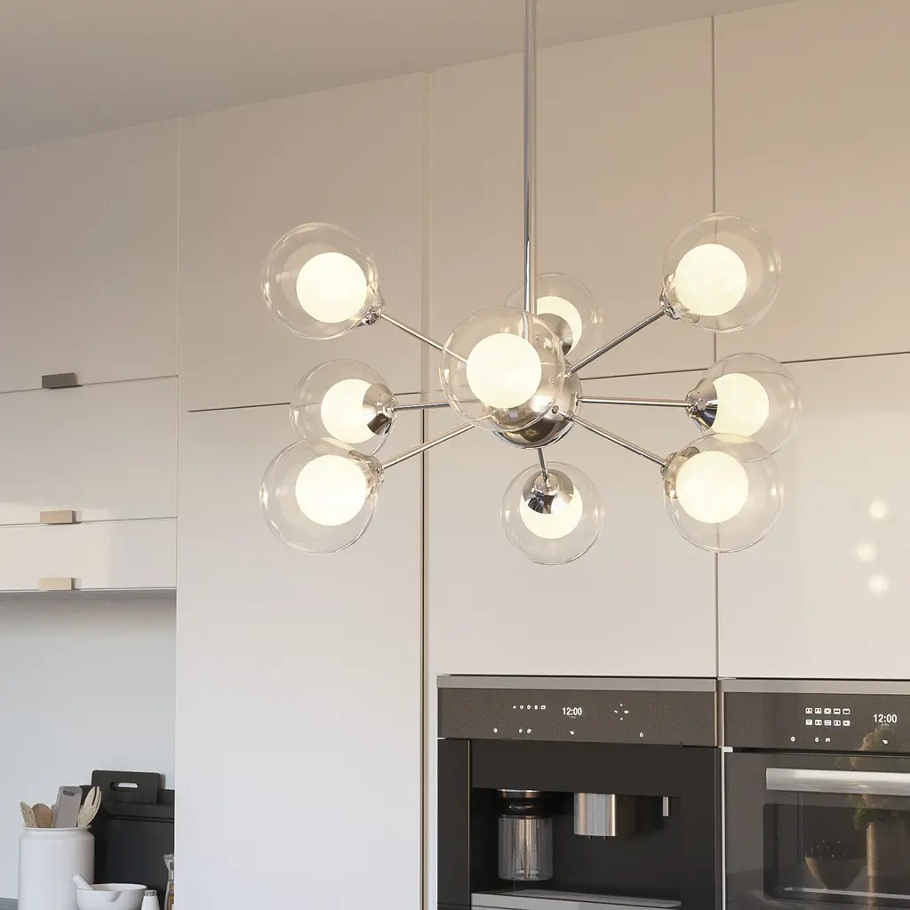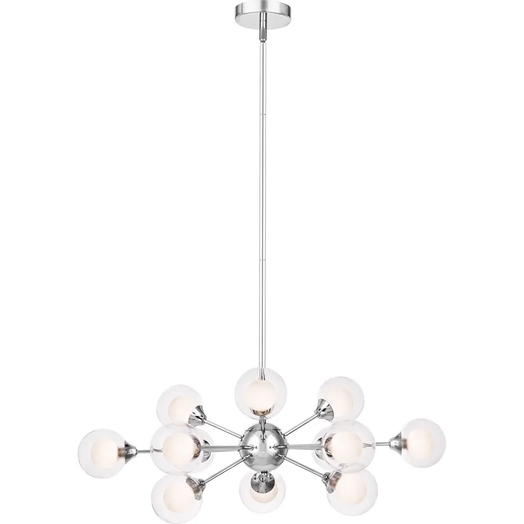 Find yourself mesmerized by the vintage beauty of the Spellbound, a stunning member of Platinum by Quoizel. Inspired by the sputnik designs of decades past, this collection is truly retro reimagined. Spheres of shimmering ice glass are encased in outer shades of clear glass, resulting in a glittering display of light. The polished chrome arms and sockets adds a contemporary edge to finish the look.