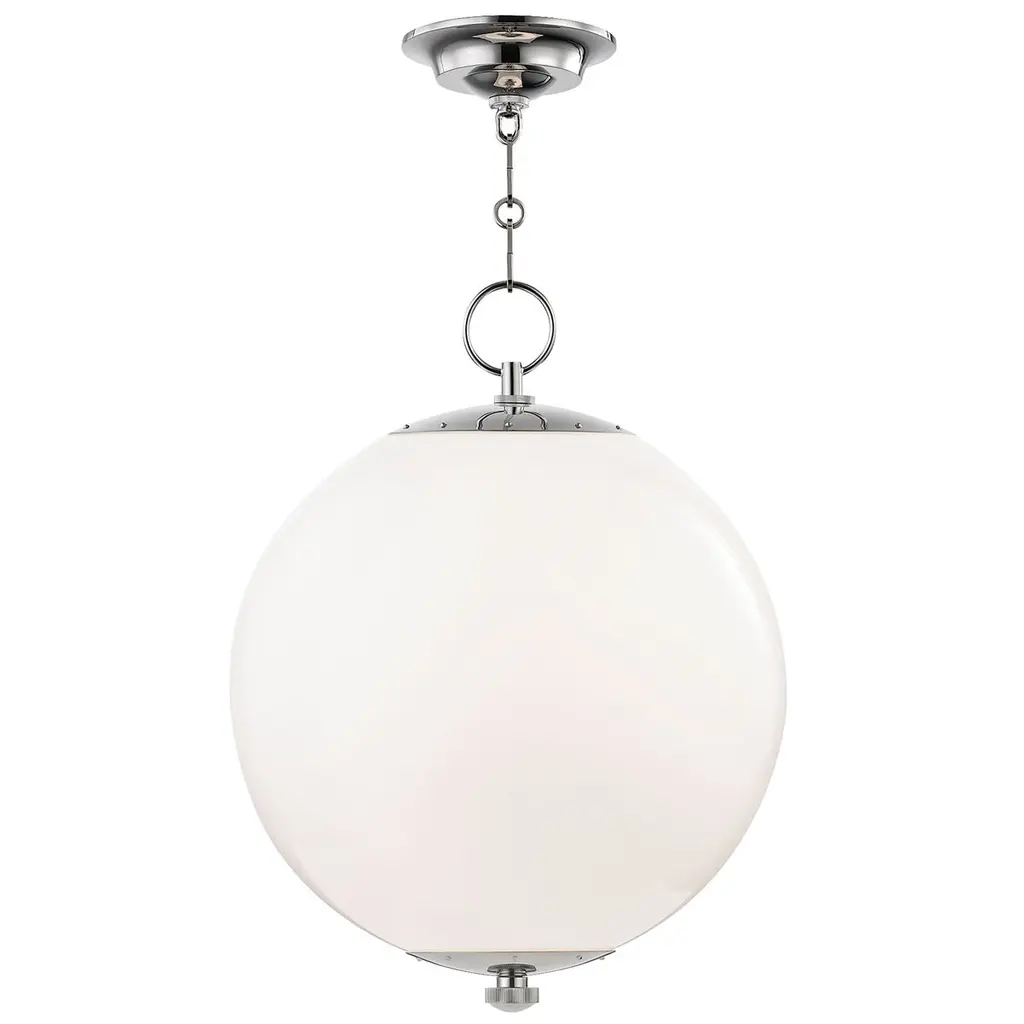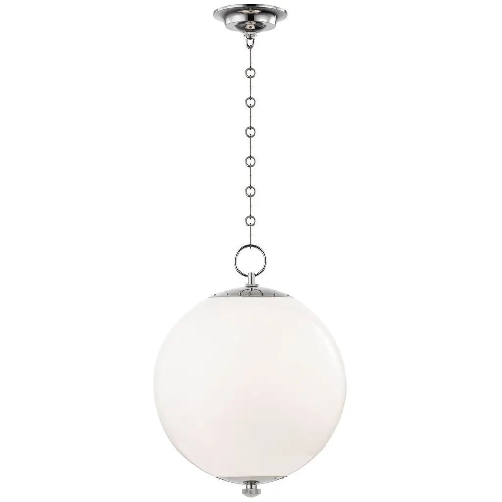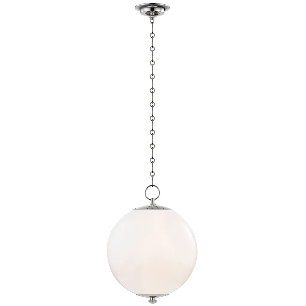 A contemporary interpretation of Parisian bistro chic, this globe-shape pendant is equally at home above a dining table, in an entryway, or in a bathroom. The white glass ensures a warm, flattering glow.