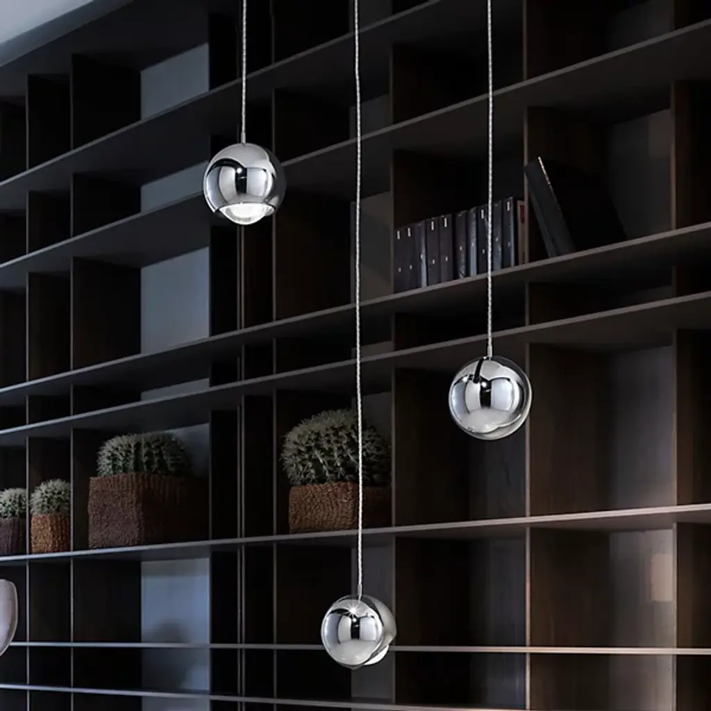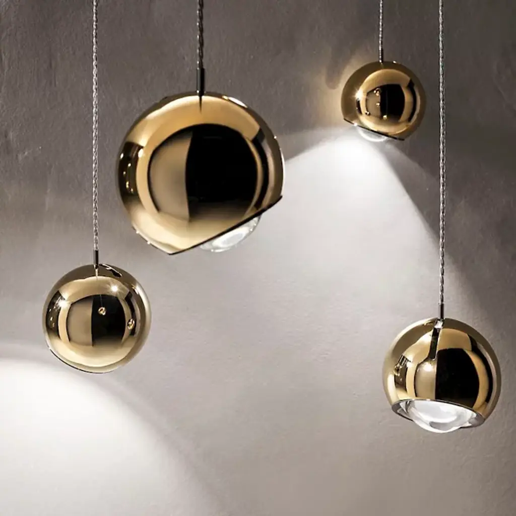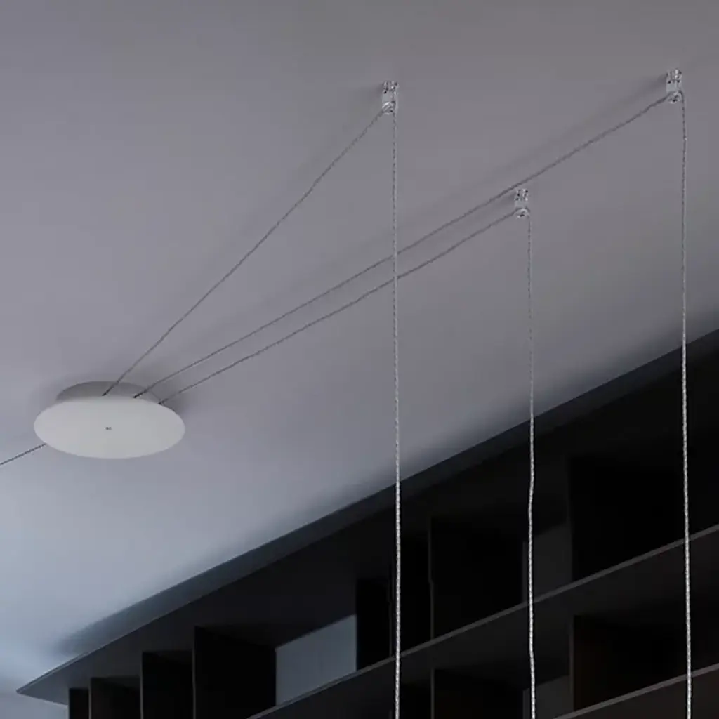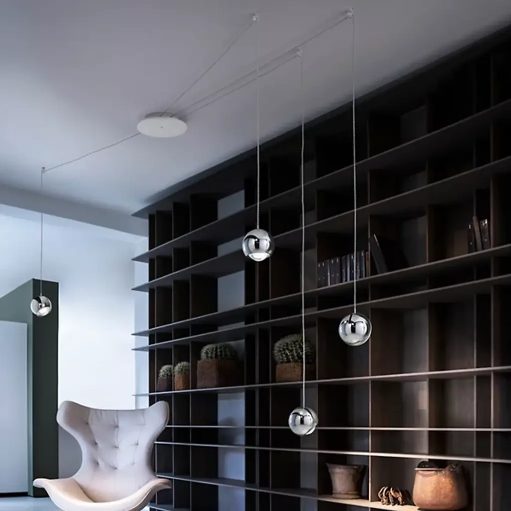 The Spider 4-Light Multi-Light Pendant by LODES was designed in 2016, and is made in Italy. Create a unique, custom web of light with the Spider 4-Light Multi-Light Pendant Light. This modern pendant light is mounted to the ceiling by a round canopy where the cords extend out from the sides rather than down from the bottom. To further create a custom lighting arrangement, this fixture includes 4 hooks that can be positioned anywhere on the ceiling so the pendants can be suspended at varying heights in different areas of the room rather than clustered together right below the canopy. Each shade can be oriented side to side and up and down to shine light where ever desired. Available in several metallic finishes, this decorative pendant light is perfect for illuminating a space while creating a bold, design statement in an entryway, bedroom, dining room, or living room.