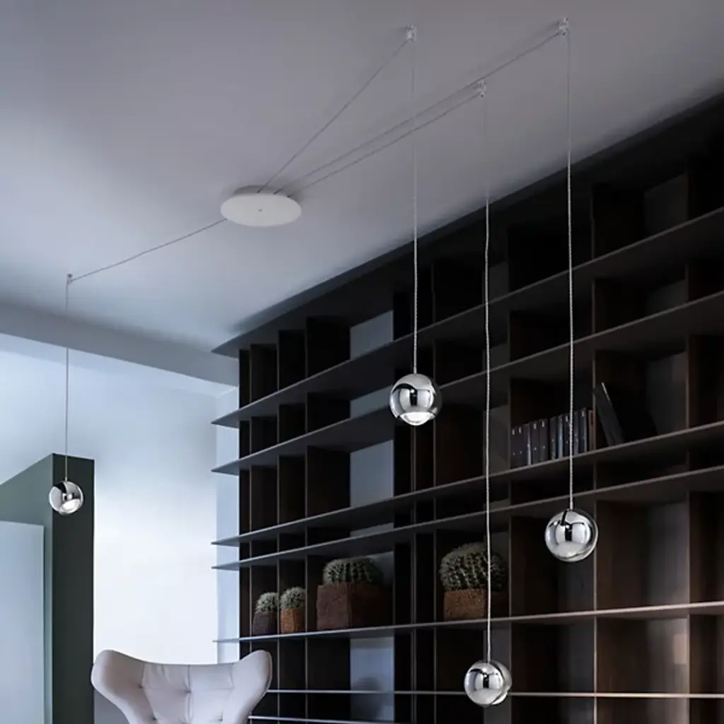 The Spider 4-Light Multi-Light Pendant by LODES was designed in 2016, and is made in Italy. Create a unique, custom web of light with the Spider 4-Light Multi-Light Pendant Light. This modern pendant light is mounted to the ceiling by a round canopy where the cords extend out from the sides rather than down from the bottom. To further create a custom lighting arrangement, this fixture includes 4 hooks that can be positioned anywhere on the ceiling so the pendants can be suspended at varying heights in different areas of the room rather than clustered together right below the canopy. Each shade can be oriented side to side and up and down to shine light where ever desired. Available in several metallic finishes, this decorative pendant light is perfect for illuminating a space while creating a bold, design statement in an entryway, bedroom, dining room, or living room.