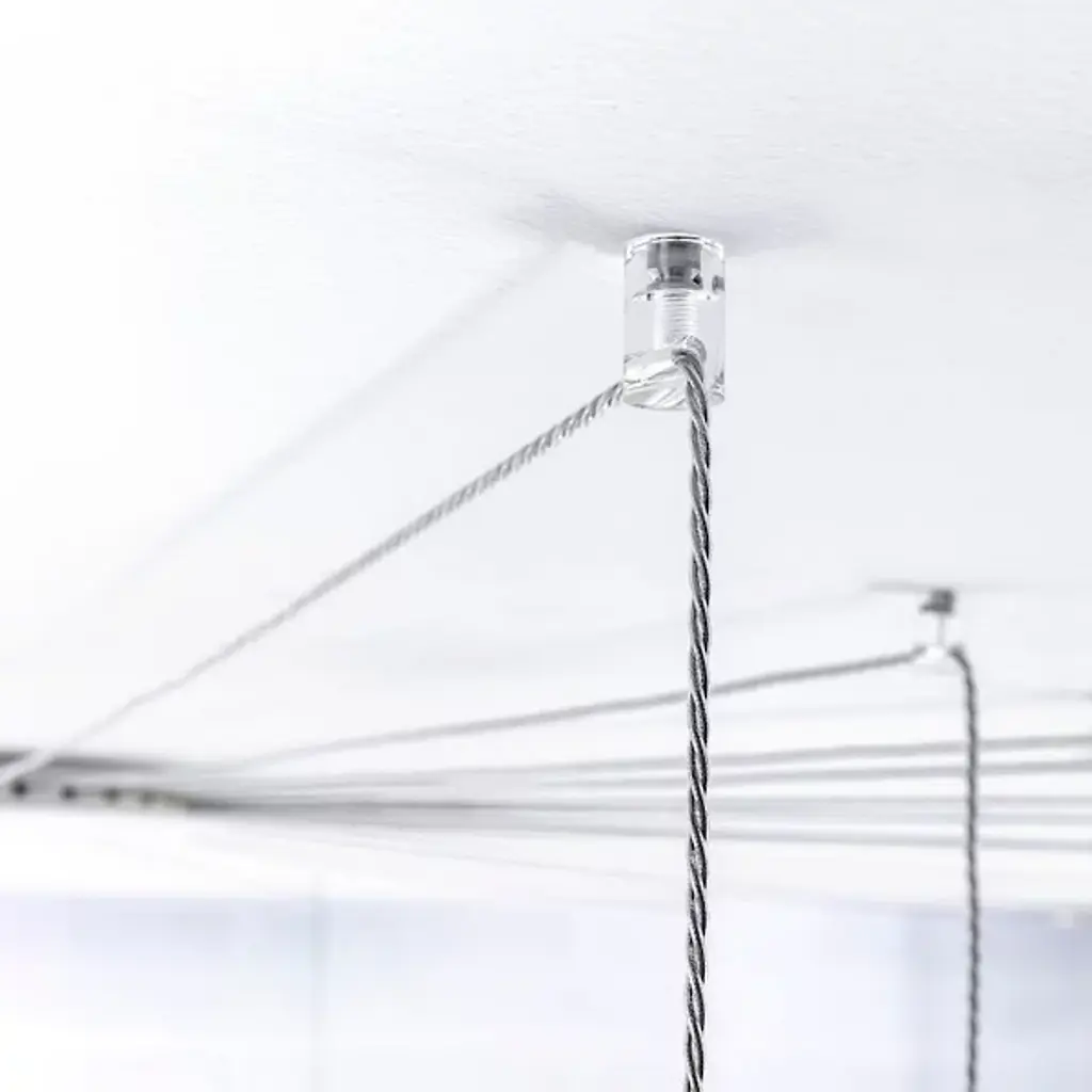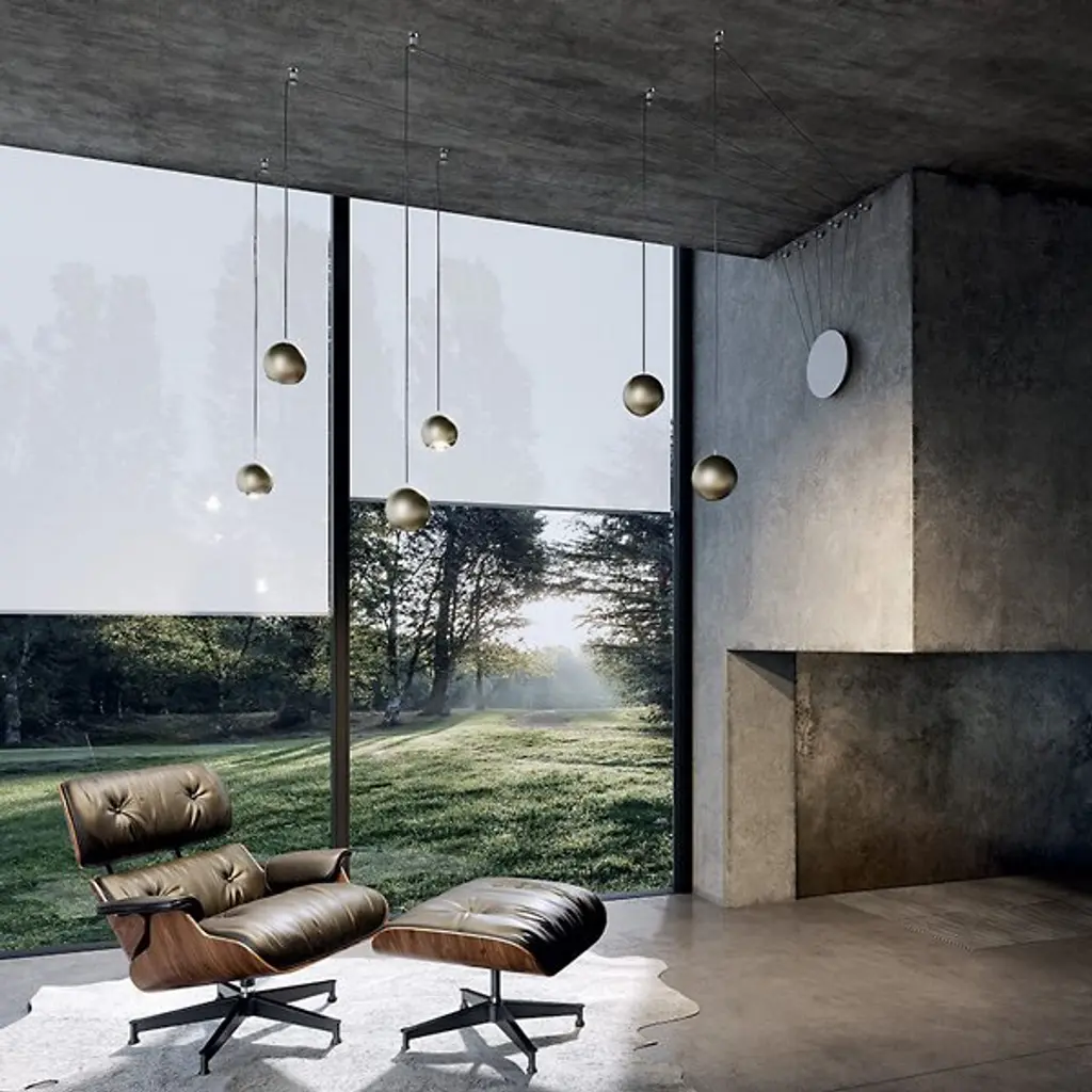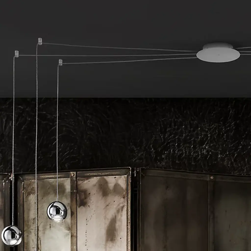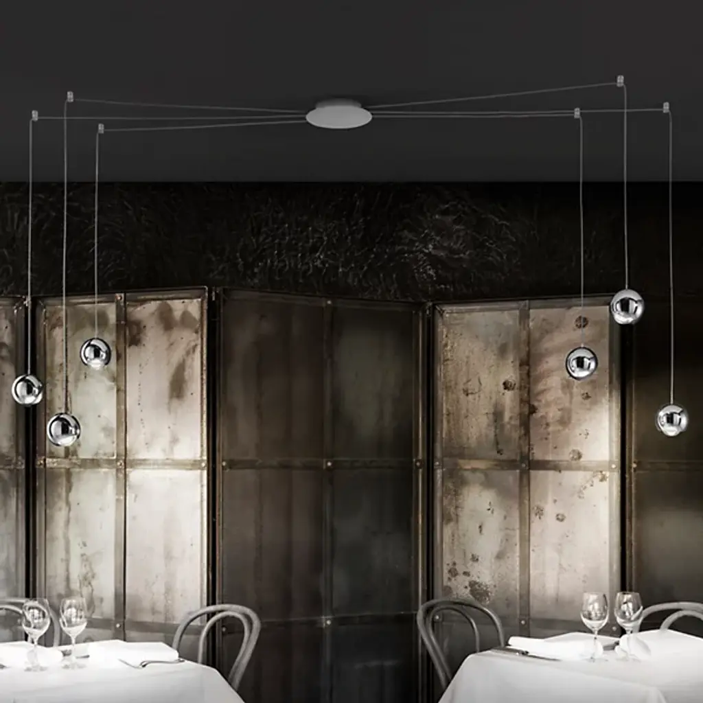 The Spider 6 Light Multipoint Pendant Light was designed in 2016, and is made in Italy. Create a unique, custom web of light with the Spider 6 Light Multipoint Pendant Light. This modern pendant light is mounted to the ceiling by a round canopy where the cords extend out from the sides rather than down from the bottom. To further create a custom lighting arrangement, this fixture includes 6 hooks that can be positioned anywhere on the ceiling so the pendants can be suspended at varying heights in different areas of the room rather than clustered together right below the canopy. Each shade can be oriented side to side and up and down to shine light where ever desired. Available in several metallic finishes, this decorative pendant light is perfect for illuminating a space while creating a bold, design statement in an entryway, bedroom, dining room, or living room.