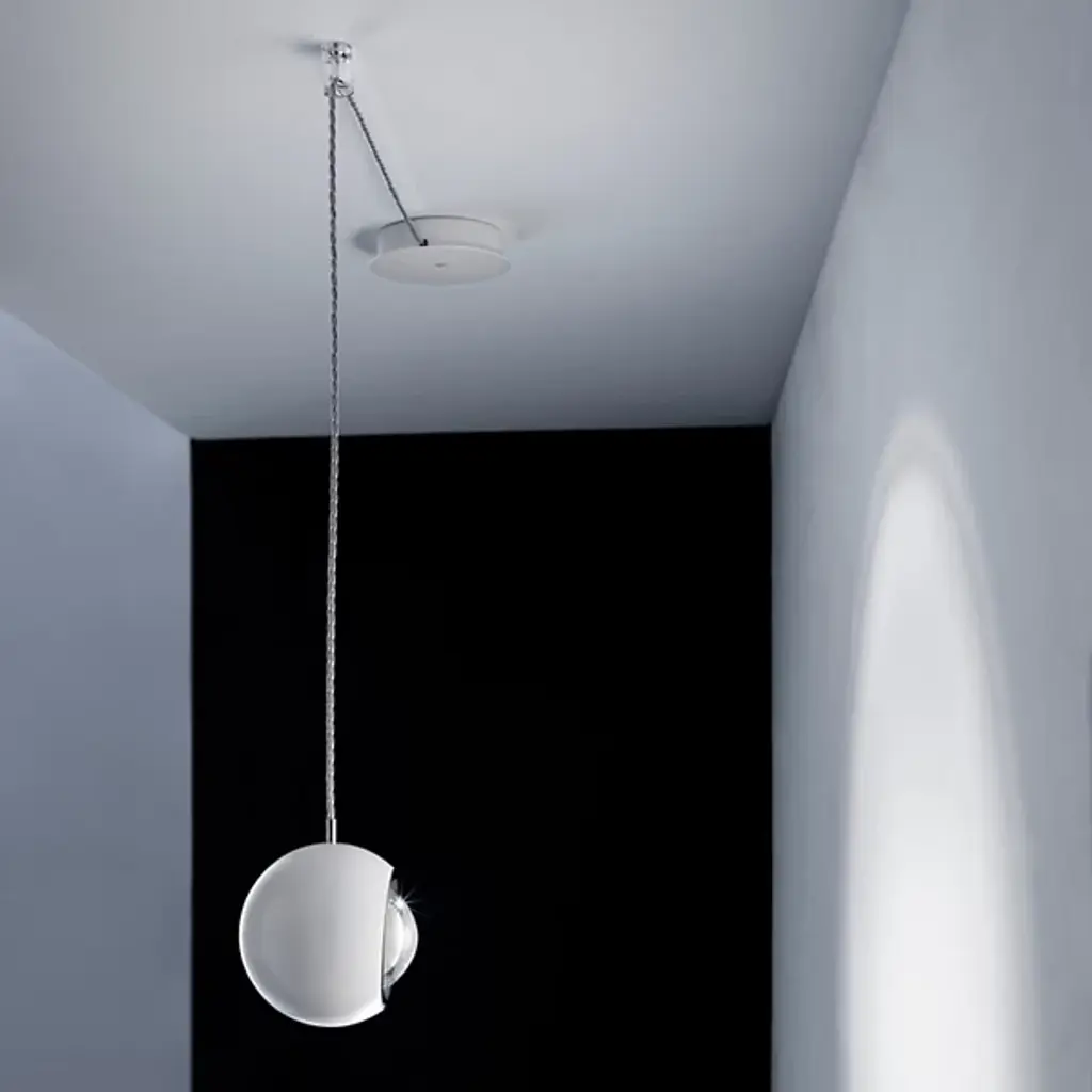 The Spider Pendant Light was designed in 2016, and is made in Italy. Create a unique, custom web of light with the Spider Pendant Light. This modern pendant light is mounted to the ceiling by a round canopy where the cord extends out from the side rather than down from the bottom. To further create a custom lighting arrangement, this fixture includes a hook that can be positioned anywhere on the ceiling so the pendant can be suspended in a different area of the room rather than suspended right below the canopy. The shade can be oriented side to side and up and down to shine light where ever desired. Available in several metallic finishes, this decorative pendant light is perfect for illuminating a space while creating a bold, design statement in an kitchen, bedroom, dining room, or living room.