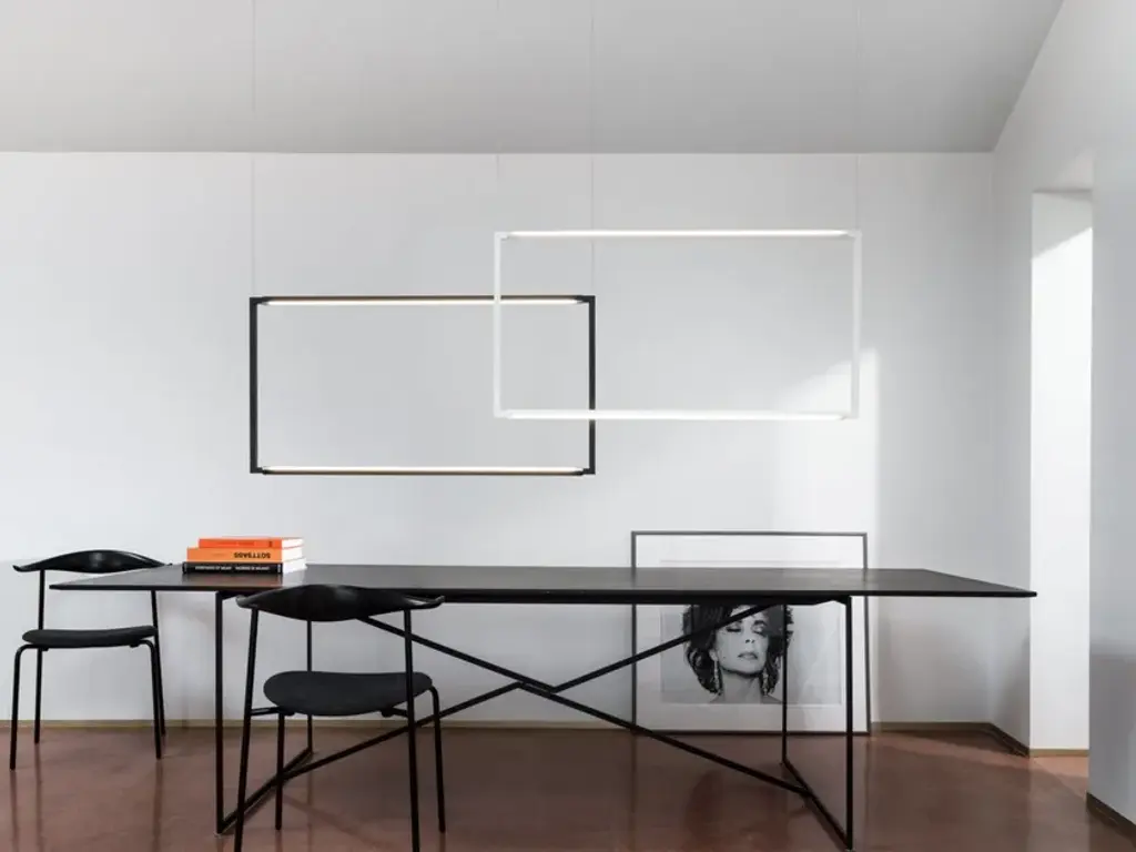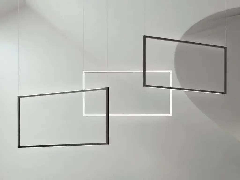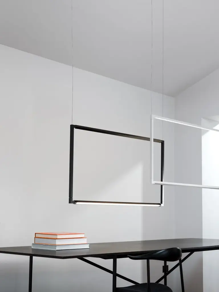 Source: 2xlinear LEDTotal power: 24+24W / 19+19WEmission: double, diffusedSwitching: mono switch, dimmable 1-10VTension: 110/240VColor temperature: 2700K / 3000KLuminous flux: 944+944lm / 1118+1118lm Typ cri 83Energy class: A+Materials: aluminium + PC + ABSNotes: cable lenght 3m, orientable diffusers 360°Net lamp weight: 2,8 KgColors:whiteblackFloor, wall/ceiling and pendant lamps based on an extruded and tubular aluminium structure, connected with moulded ABS joints, with white or black painted finish. Thanks to the joints, enabling the profiles to house LED sources, one can rotate 360° in order to produce a directional direct or indirect lighting, screened by an opaline diffuser in polycarbonate. The floor version is designed as such to provide a virtual divider to ambiences, while the ceiling and wall versions allow the enlightenment of the ambience in a versatile and a comfortable way. LED sources are dimmable and with warm tone.