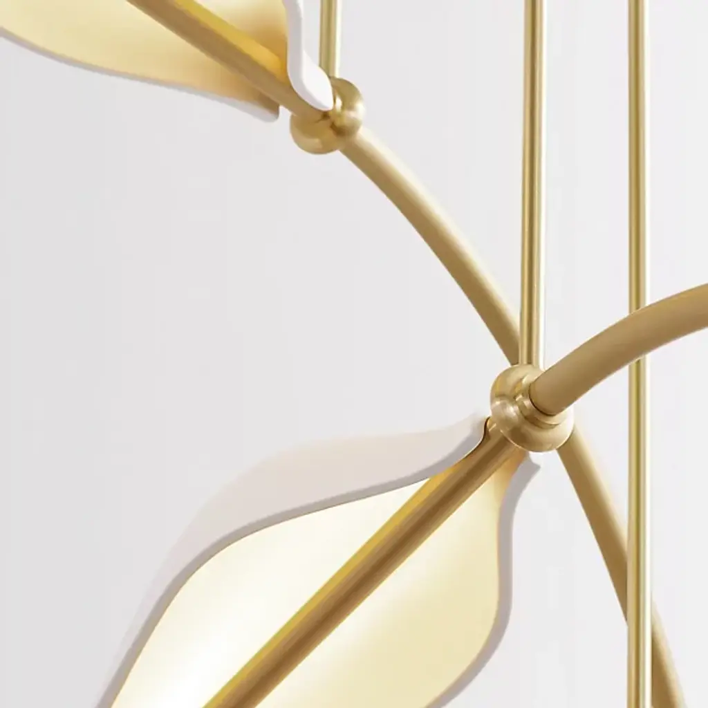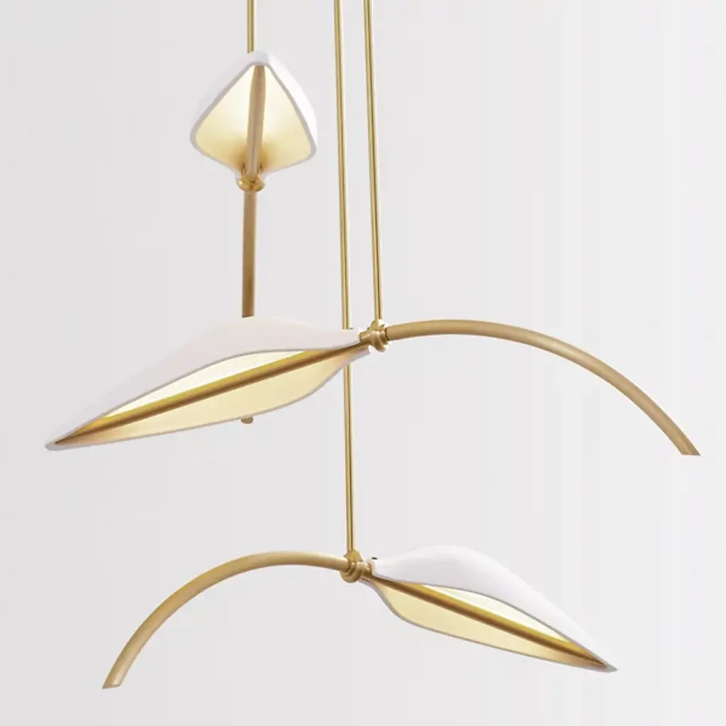 Elegant and ethereal. The Spire Leaf Pendant from Boyd Lighting blends organic and architectural inspiration as it evokes the imagery of falling leaves and the pointed roofs of epic churches. The pendant makes a beautiful first impression, making it fitting in the foyer or living room. Slender brass rods produce organic curves that appear to float in the air. The rods appear like the central vein running through a leaf. The brass creates an eye-catching contrast with the milky hue of the cast porcelain shades. The pointy shades contain the light and display a warm glaze on their interior. Each leaf lets out a soft spread of warm ambient lighting.