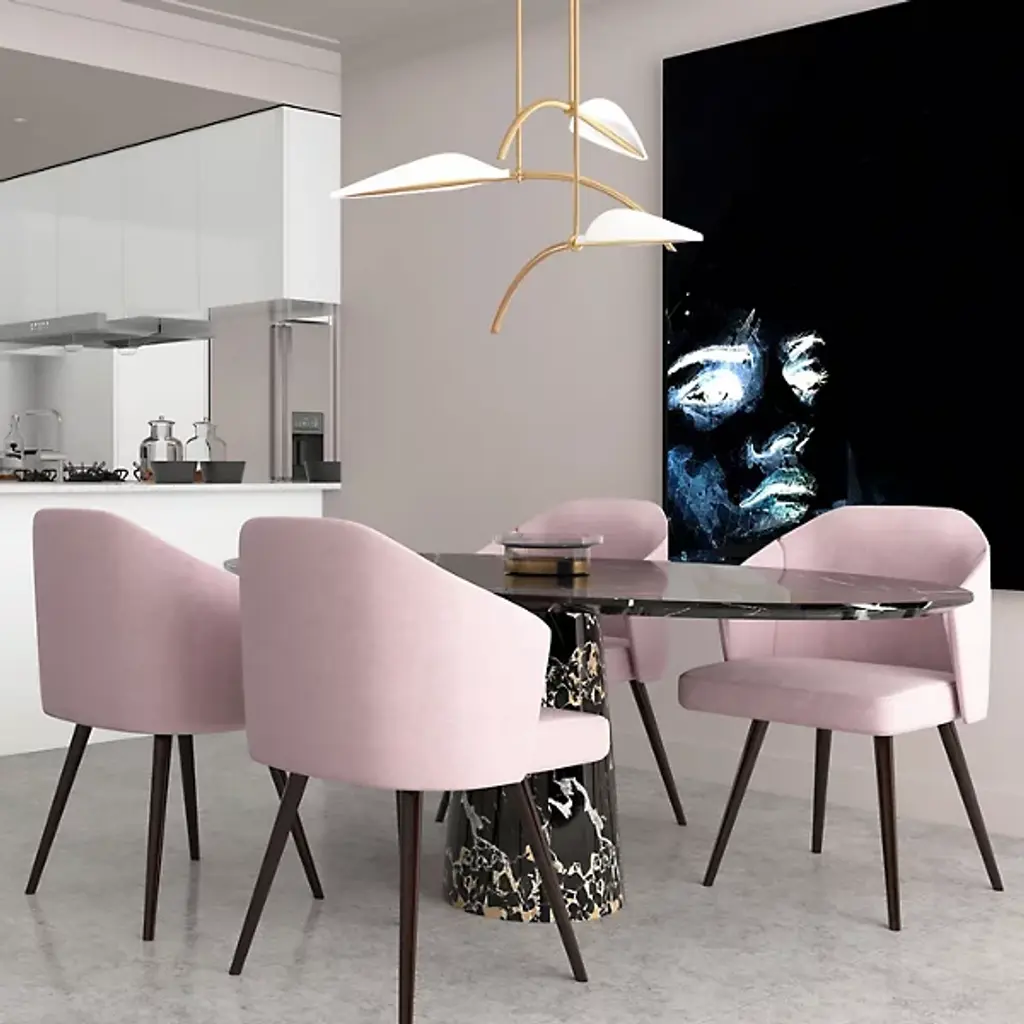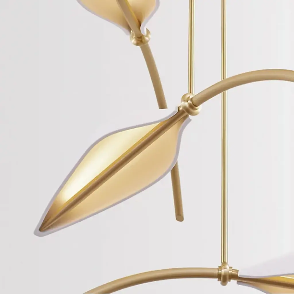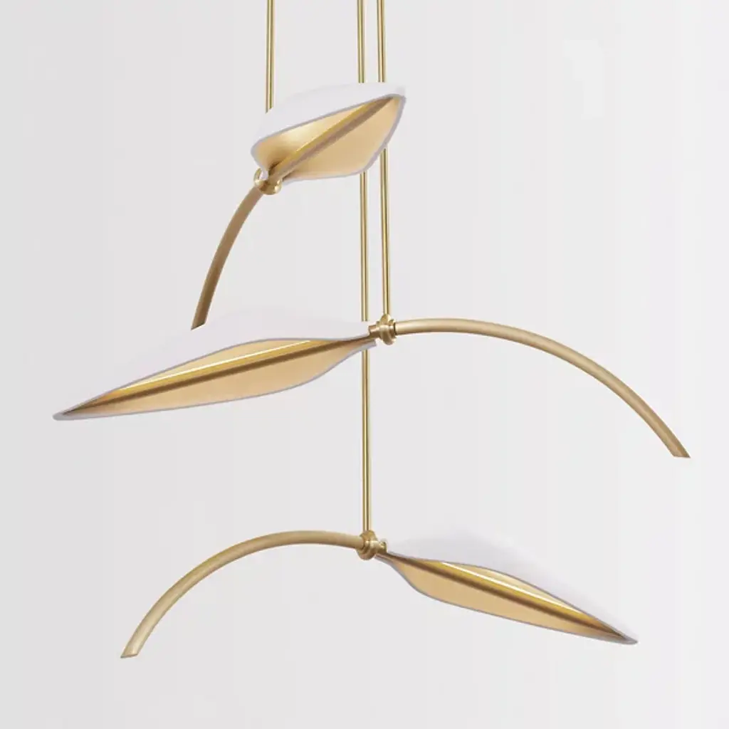 Elegant and ethereal. The Spire Leaf Pendant from Boyd Lighting blends organic and architectural inspiration as it evokes the imagery of falling leaves and the pointed roofs of epic churches. The pendant makes a beautiful first impression, making it fitting in the foyer or living room. Slender brass rods produce organic curves that appear to float in the air. The rods appear like the central vein running through a leaf. The brass creates an eye-catching contrast with the milky hue of the cast porcelain shades. The pointy shades contain the light and display a warm glaze on their interior. Each leaf lets out a soft spread of warm ambient lighting.