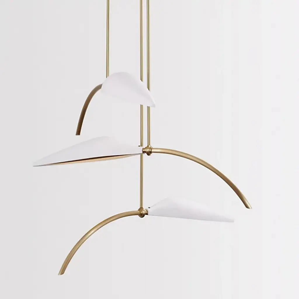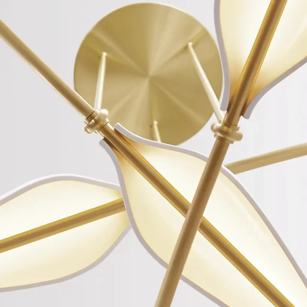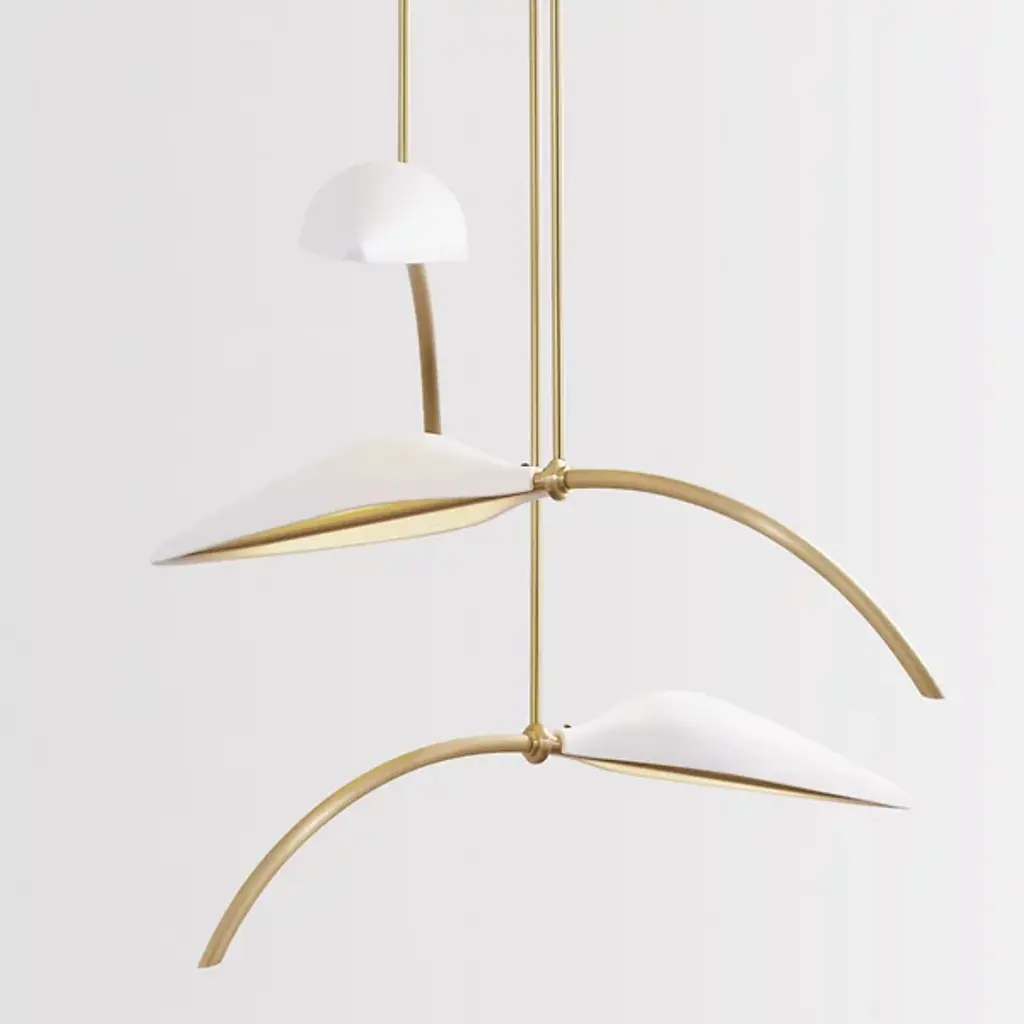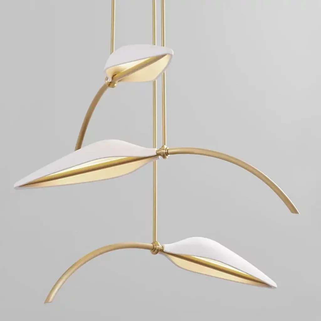 Elegant and ethereal. The Spire Leaf Pendant from Boyd Lighting blends organic and architectural inspiration as it evokes the imagery of falling leaves and the pointed roofs of epic churches. The pendant makes a beautiful first impression, making it fitting in the foyer or living room. Slender brass rods produce organic curves that appear to float in the air. The rods appear like the central vein running through a leaf. The brass creates an eye-catching contrast with the milky hue of the cast porcelain shades. The pointy shades contain the light and display a warm glaze on their interior. Each leaf lets out a soft spread of warm ambient lighting.