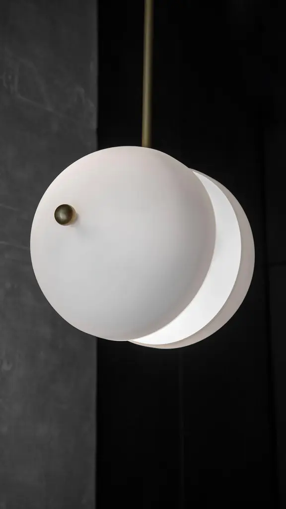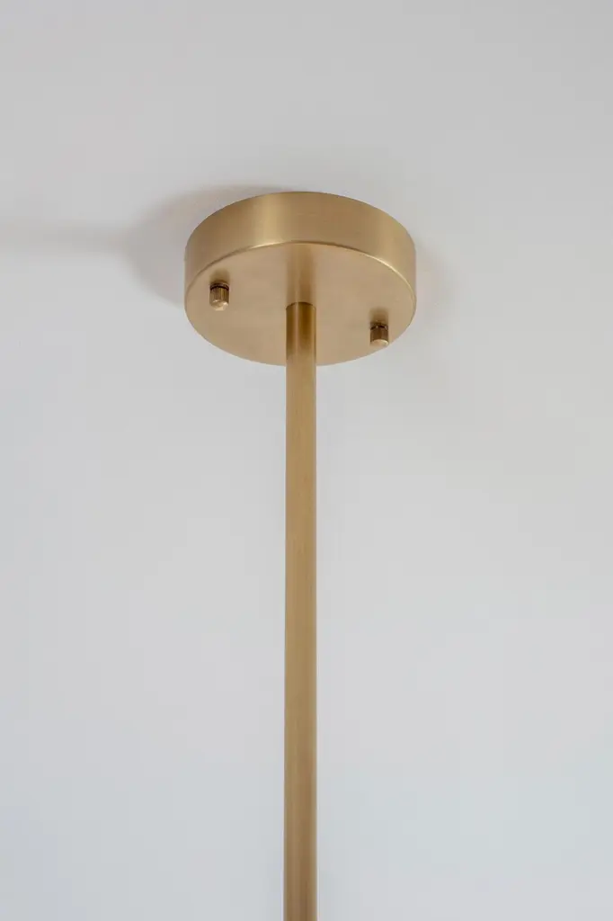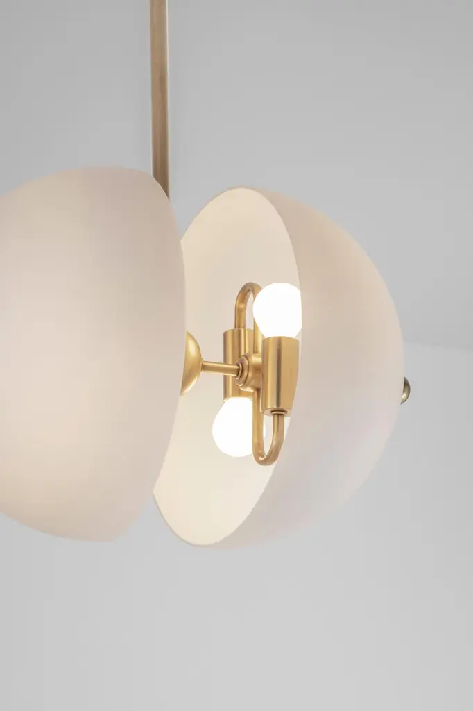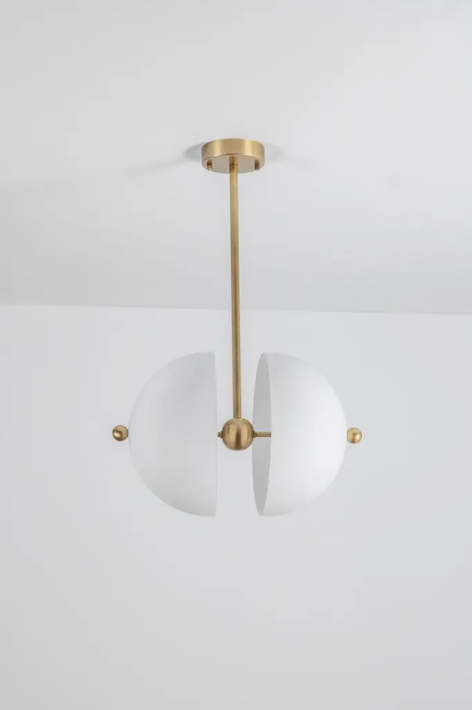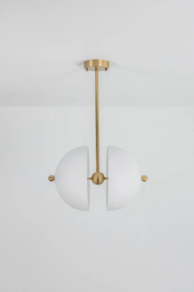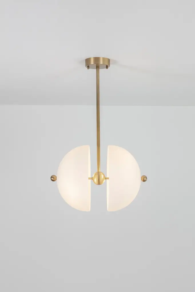 Split circle pendant lamp by Square in CircleDimensions: H 69 x W 45 x D 35 cmMaterials: Brushed brass finish, white lowder coated metal, white glassMinimalistic white glass and brass pendant light. Two glass domes are attached to the brass body, allowing the light to shine from both shades, which are connected with a simple round finish. The structure is supported by a central brass round joint.Square in circle is a London-based design studio founded in 2019. The studio explores lighting design in minimal, geometric forms inspired by the Modernist Era. Materials such as marble, metal and glass combine to make each sculptural piece a 'total and complete work of art', as in the manner of Gesamtkunstwerk.All our lamps can be wired according to each country. If sold to the USA it will be wired for the USA for instance.