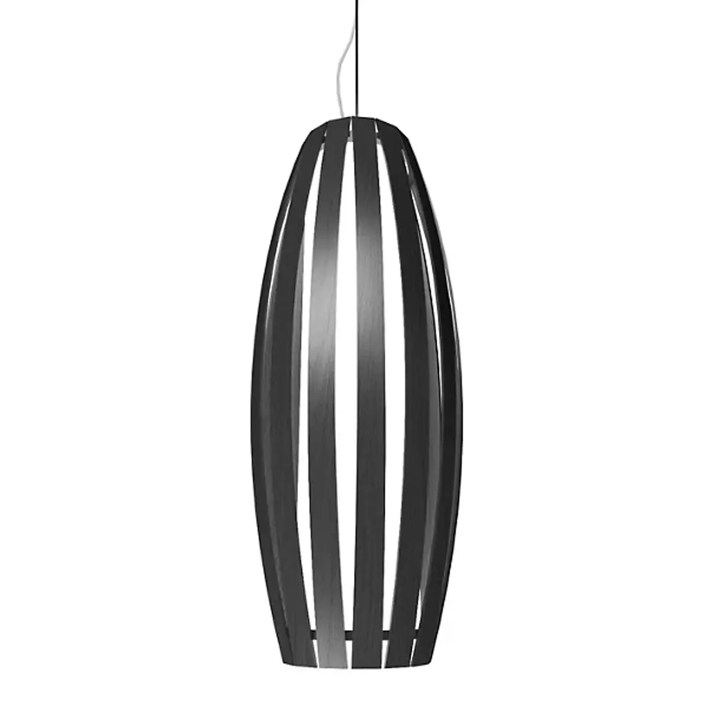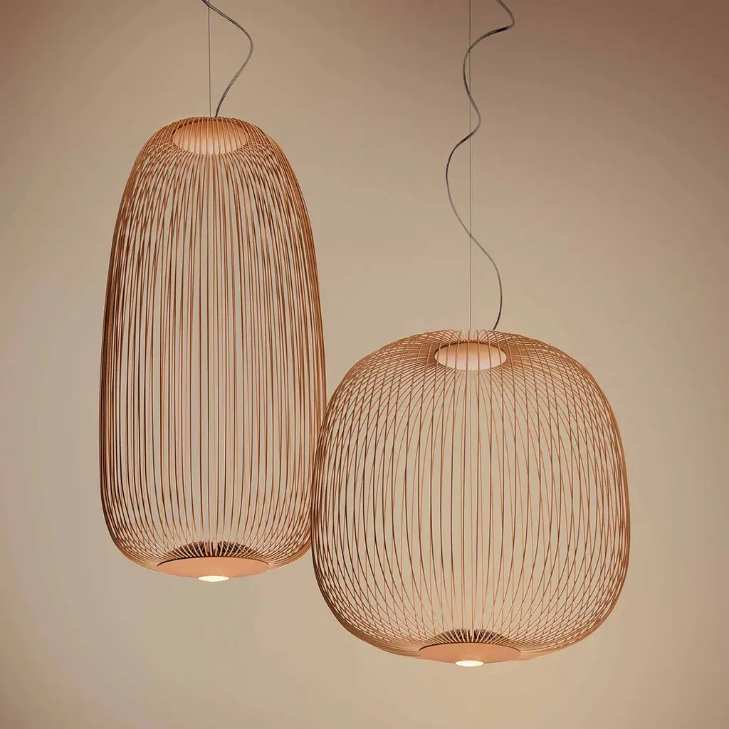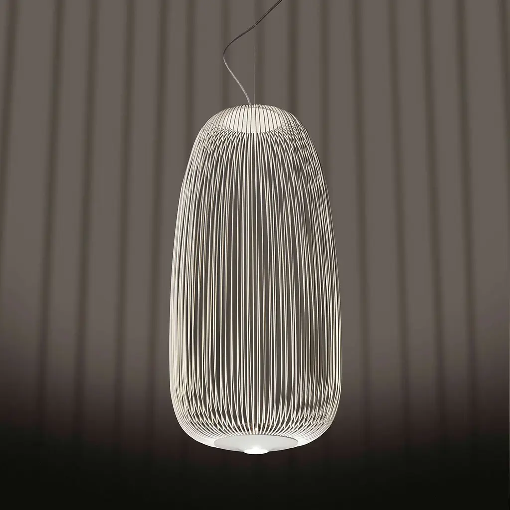 A slender cage of powder-coated steel arcs around an invisible core—Spokes 1 hangs like a stretched lantern, its oval form traced only by thin vertical ribs. Designed by García Cumini, the shade feels light enough to sway in a breeze, yet the geometry is rigid, giving the piece a calm, structural presence. A concealed LED module nests in the aluminum hub, sending a clear pool of light downward while threads of brightness slip through the gaps, striping nearby walls with soft, graphic shadows. The fixture weighs barely four kilos, so even the larger 24-inch version is easy to mount over a dining table or in a lobby cluster. A transparent power cord hides inside one spoke, keeping the silhouette clean. Finishes—Matte White, Ink Black, Warm Gold, or Copper—shift from airy to dramatic, making Spokes 1 adaptable to intimate living spaces and tall commercial atriums alike.