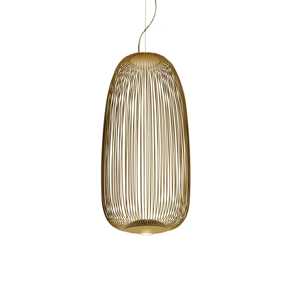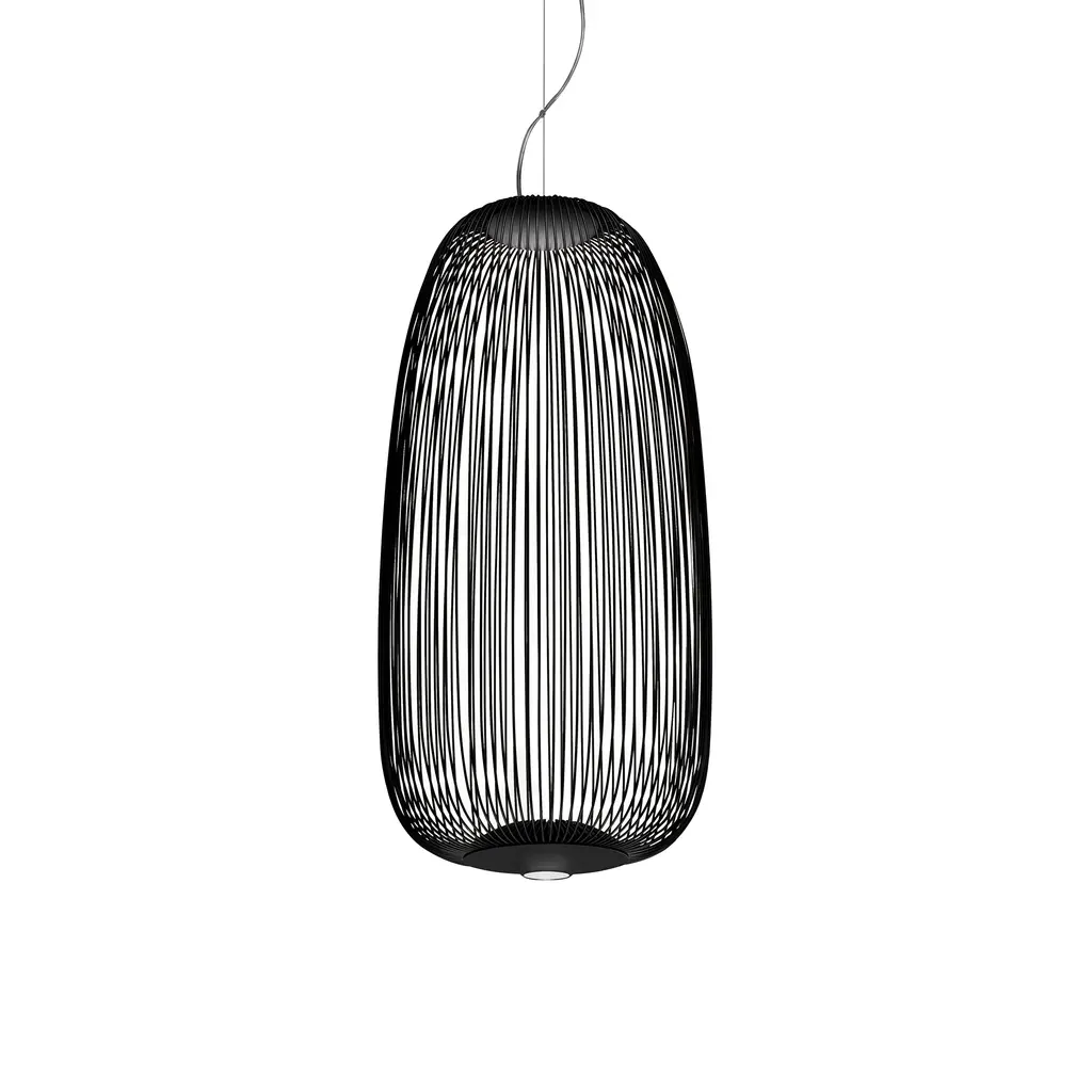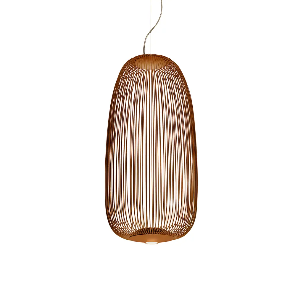 A slender cage of powder-coated steel arcs around an invisible core—Spokes 1 hangs like a stretched lantern, its oval form traced only by thin vertical ribs. Designed by García Cumini, the shade feels light enough to sway in a breeze, yet the geometry is rigid, giving the piece a calm, structural presence. A concealed LED module nests in the aluminum hub, sending a clear pool of light downward while threads of brightness slip through the gaps, striping nearby walls with soft, graphic shadows. The fixture weighs barely four kilos, so even the larger 24-inch version is easy to mount over a dining table or in a lobby cluster. A transparent power cord hides inside one spoke, keeping the silhouette clean. Finishes—Matte White, Ink Black, Warm Gold, or Copper—shift from airy to dramatic, making Spokes 1 adaptable to intimate living spaces and tall commercial atriums alike.