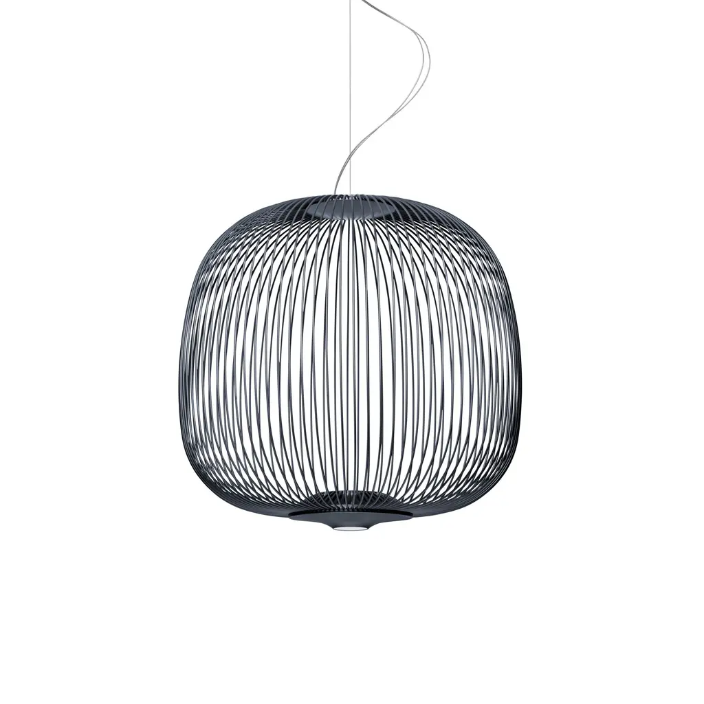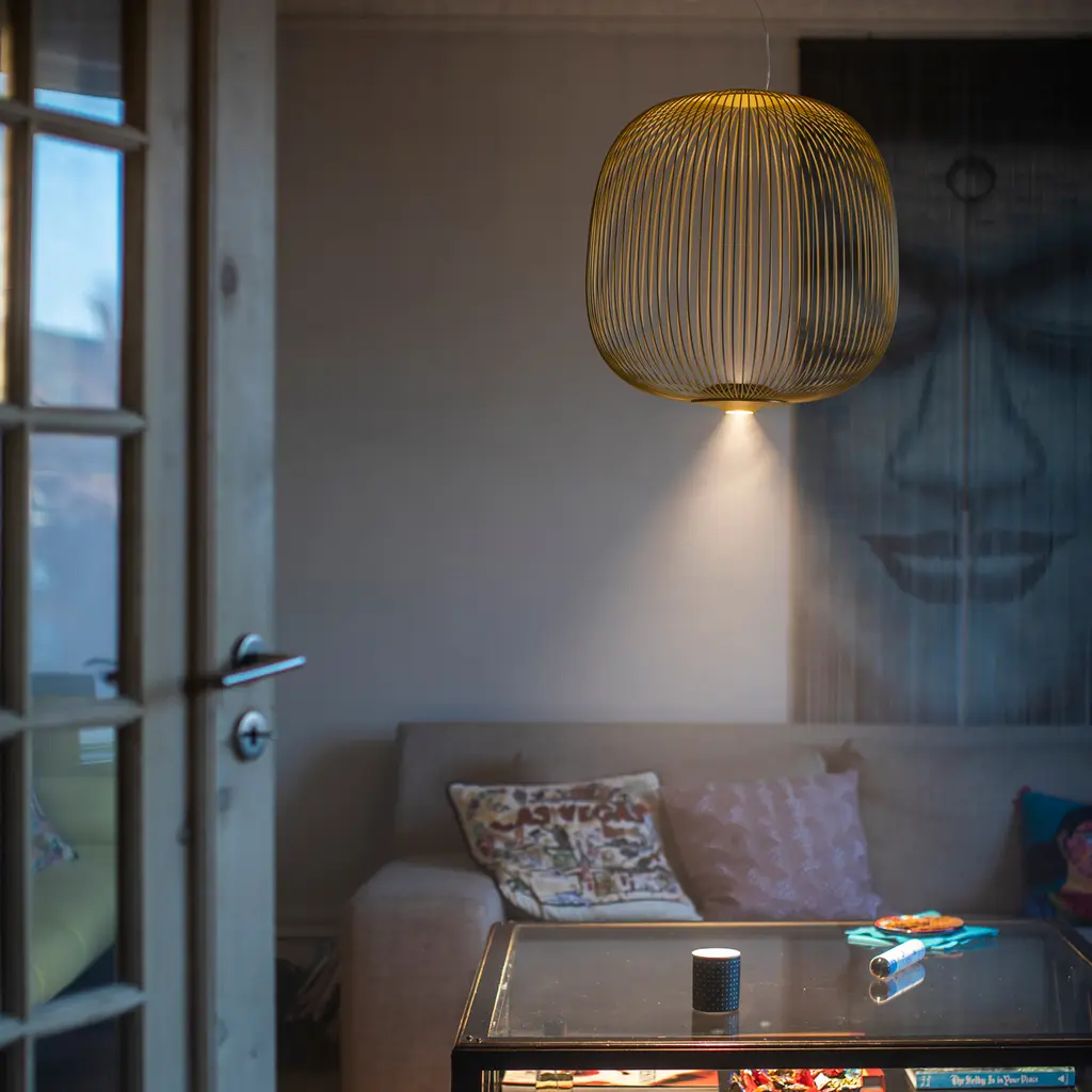 Slender metal ribs trace an airy oval, turning light itself into a pattern of lines that glide across walls and tabletops. This smaller Spokes 2 takes the lantern-like form of the original and scales it for kitchens, bars, or cafés—anywhere you’d tuck a row of fixtures or let a single pendant hover over an intimate table. The LEDs sit hidden inside the lower hub; when they glow, beams slide upward through the spokes, creating a ripple of shadow and brightness while a softer pool gathers below. Choose copper for a warm glint at dusk, graphite for a restrained silhouette, or matte white when you want the glow to do all the talking. Hang one, hang three, mix it with the taller Spokes 1—the open structure keeps every arrangement feeling light and quietly animated.