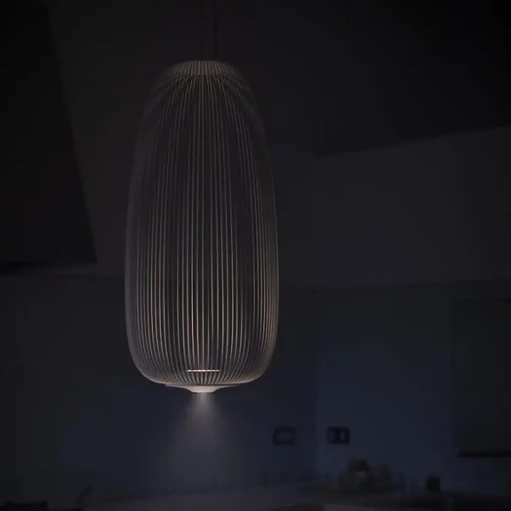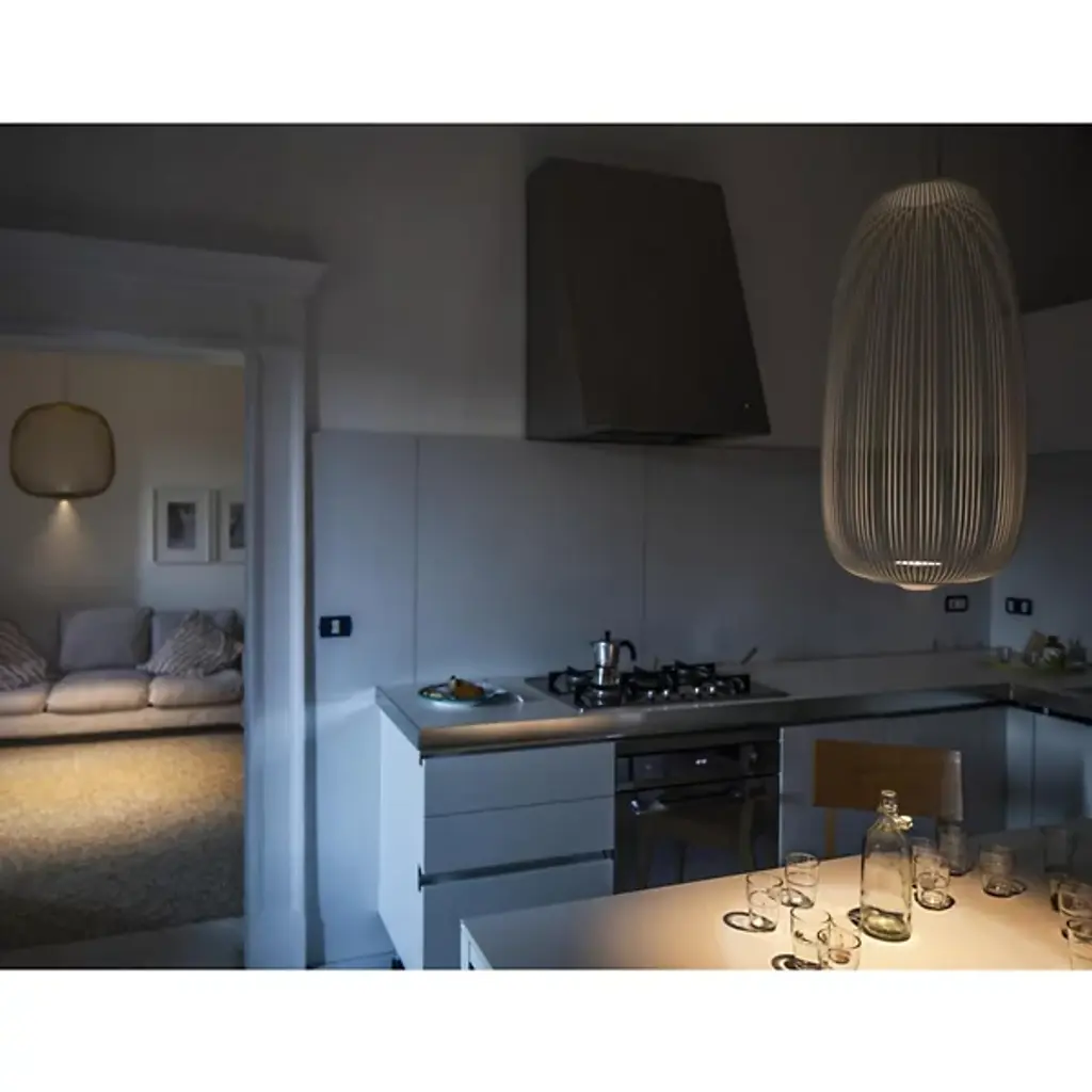 Inspired by the radial bars of a bicycle wheel, the Foscarini Spokes Long LED Pendant is able to create an ethereal spread of light with a simple metal construction and elegant LED fittings. A thin light module is housed in the base of the oblong shape, projecting light both upward and down, reflecting off each rod as linear shadows are projected around the room. Discreetly suspended from ultra-thin cables, the fixture has an overall effect of weightlessness, emitting a soft combination of ambient and functional light.