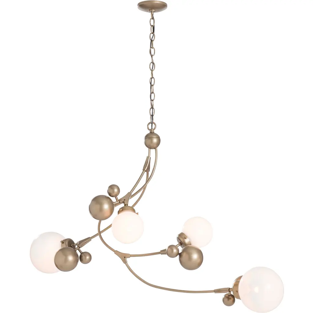 Steel and glass “berries” of multiple sizes, create a sculptural focal point in any setting. The Sprig Chandelier’s botanical overtones are enhanced by opaline, clear water glass, or opal glass options, and your choice of finishes. Versatile and visually balanced, it is a perfect choice to hang individually, or in groupings.