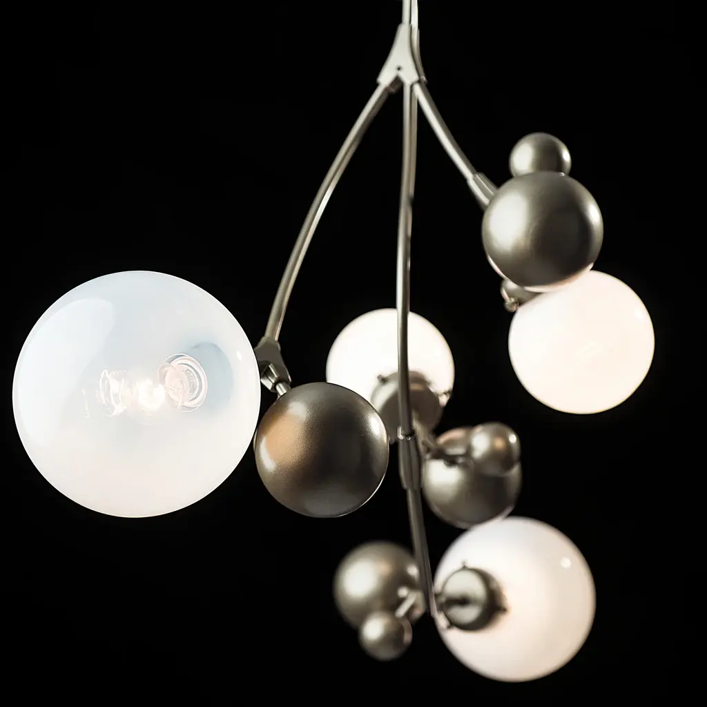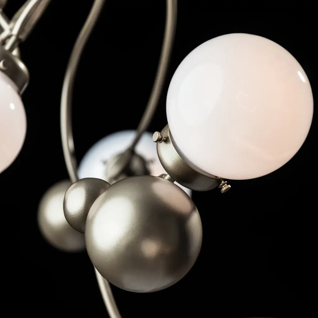 Conjuring up the joy of a bountiful harvest, the Sprig Pendant alludes to a bramble branch abundant with ripe berries ready for picking. Gracefully curving metal forms meander down into rounded forms and finish with the soft illumination of round glass shades. Delicate in appearance yet durable in construction, the Sprig Pendant is an artistic piece of designer lighting that will add plentiful charm to your home.Hubbardton Forge lighting is handcrafted in Vermont, USA by highly skilled artisans. Every lamp is made-to-order and handmade using environmentally friendly metal forging techniques. Powder coatings and aqueous metal cleaning are used in the production of every lamp.Shown in soft gold finish with opal glass