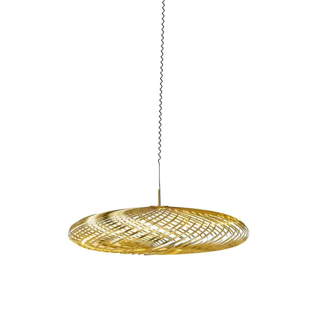 Pliant ribbons of stainless steel fan out around a custom Tom Dixon LED ring in this multiway pendant. Spring's airy formation can be adjusted to a variety of shapes—a flatter one that's reminiscent of a spirograph drawing, a "flying-saucer" configuration or a fuller silhouette akin to a pumpkin. Plated in a warm brass finish and available in 3 sizes, the spiral design allows the voluminous shade to be easily flat-packed for moving.